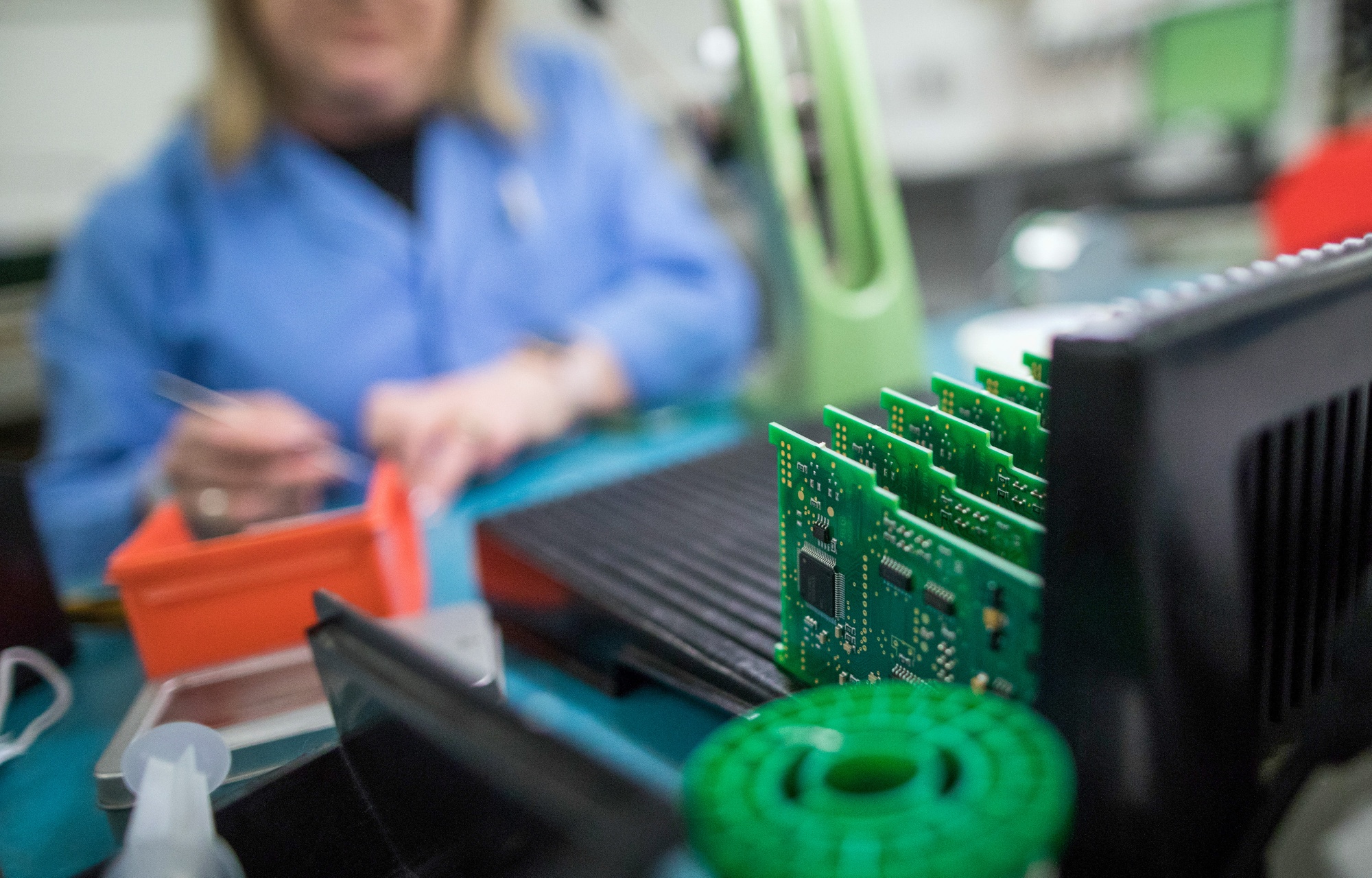 在英国一家制造商处的集成电路微芯片的印刷电路板。