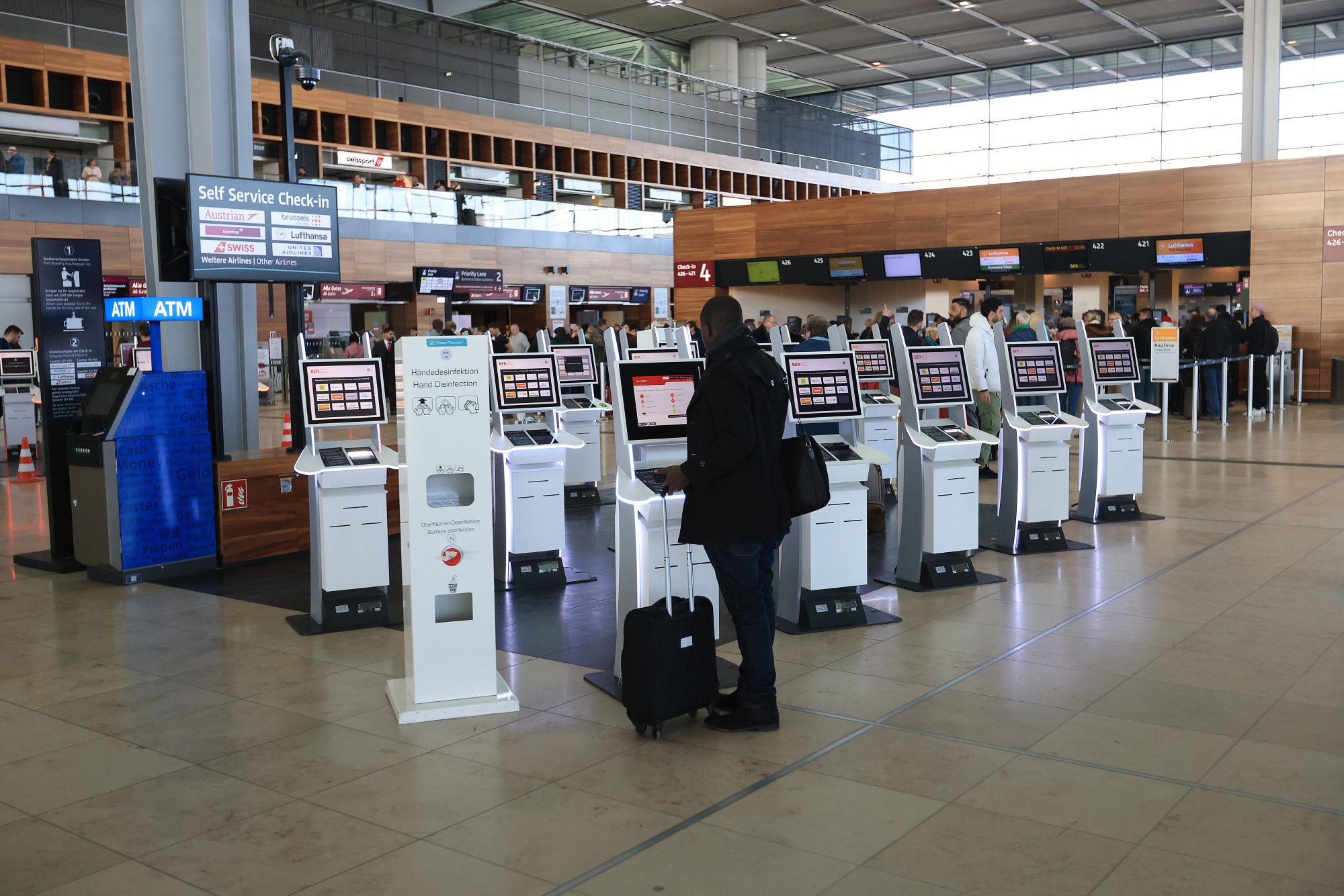 一名乘客在德国柏林柏林机场使用自助办理登机手续终端。
