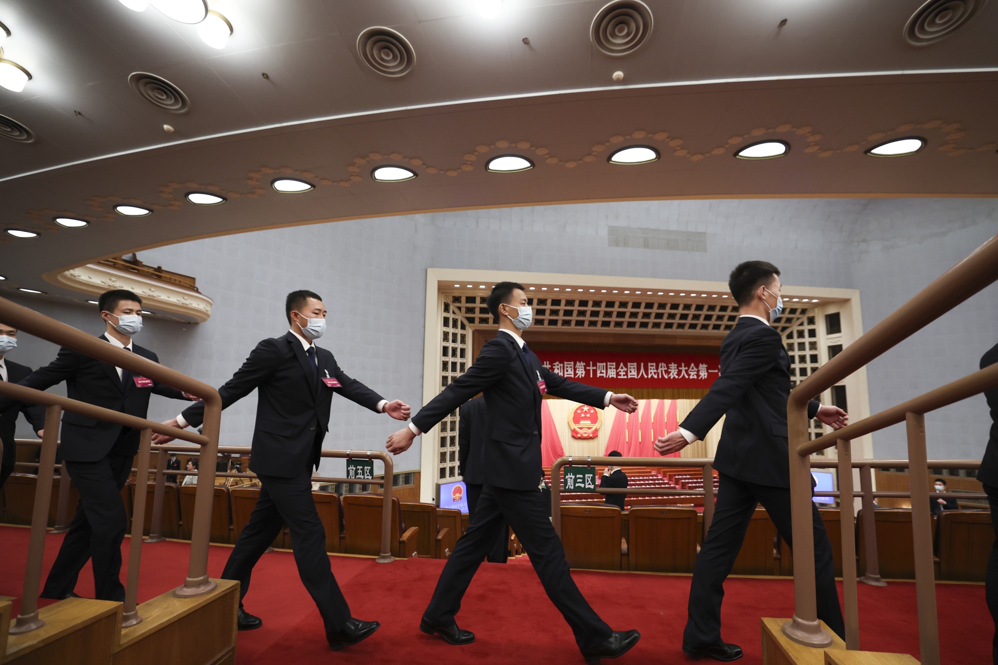 3月12日在人民大会堂开幕式前的安保人员。摄影师:Lintao Zhang/Getty Images通常在政府高层职位的选举中只有一位候选人,而反对意见极为罕见,但国家卫生健康委员会主任马晓伟的连任收到了21份反对意见和8份弃权票,是同行中反对票最多的。这可能表明一些高级立法者对习近平主席的严格的“零Covid”政策表示不满。