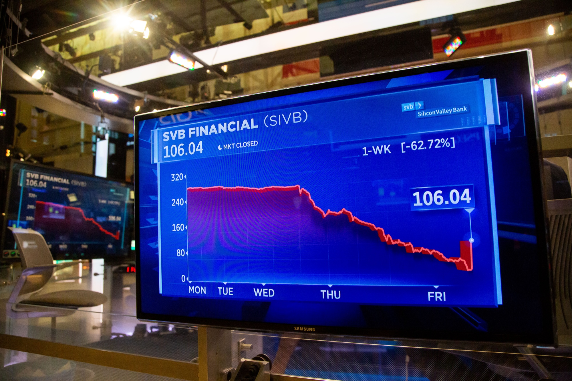 在美国纽约证券交易所的地板上展示的一张SVB金融集团图表,摄于3月10日星期五。