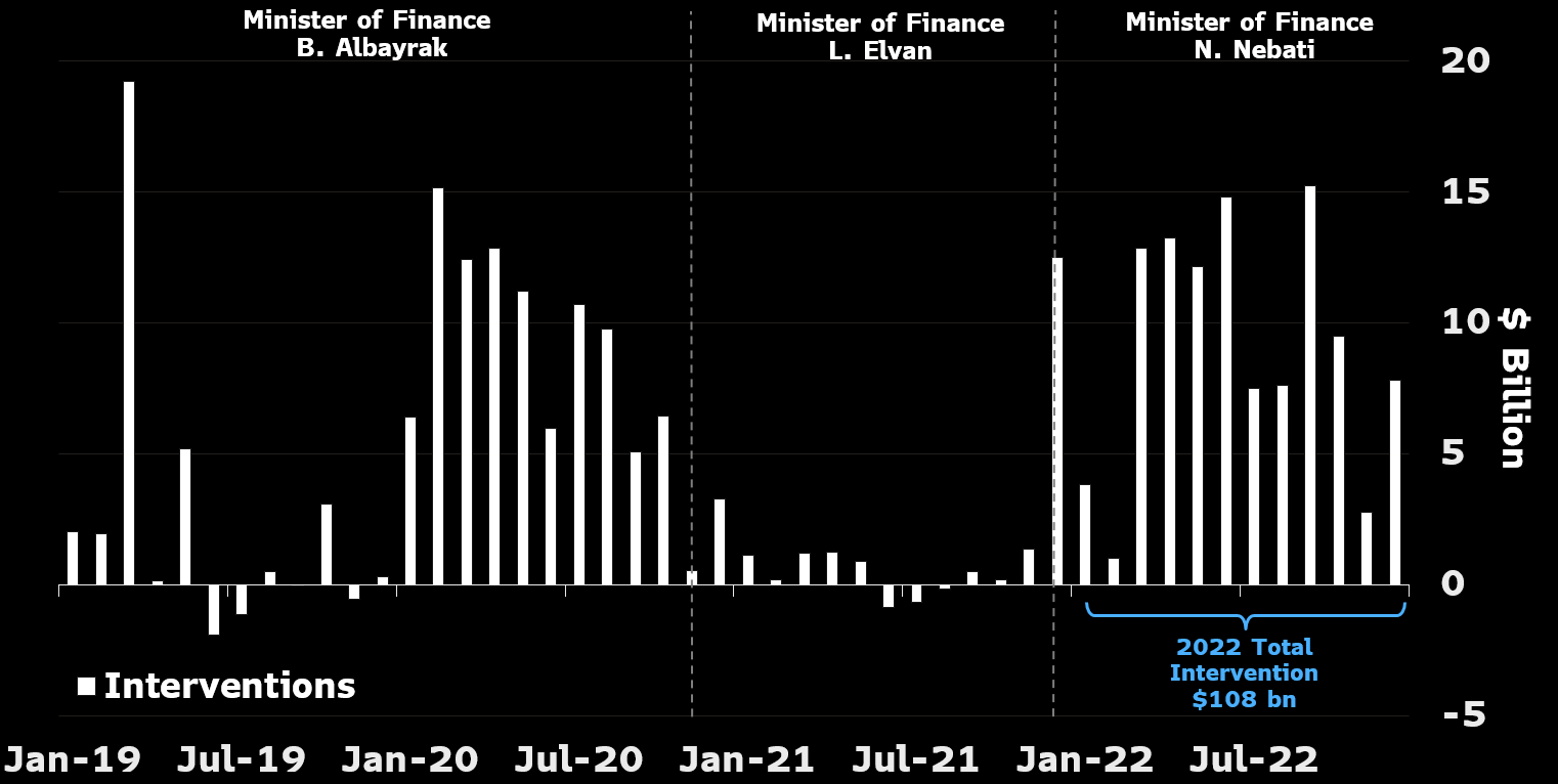 1. 外汇干预仍在发生。新兴市场在过去两个月经历了喘息,但这并没有阻止一些国家试图支撑他们的货币。俄罗斯正在出售人民币持有量以抵消原油和天然气收入减少对卢布的影响。在土耳其,我们估计中央银行的干预在2022年总计达到了1080亿美元,以限制过度宽松的货币政策的影响。