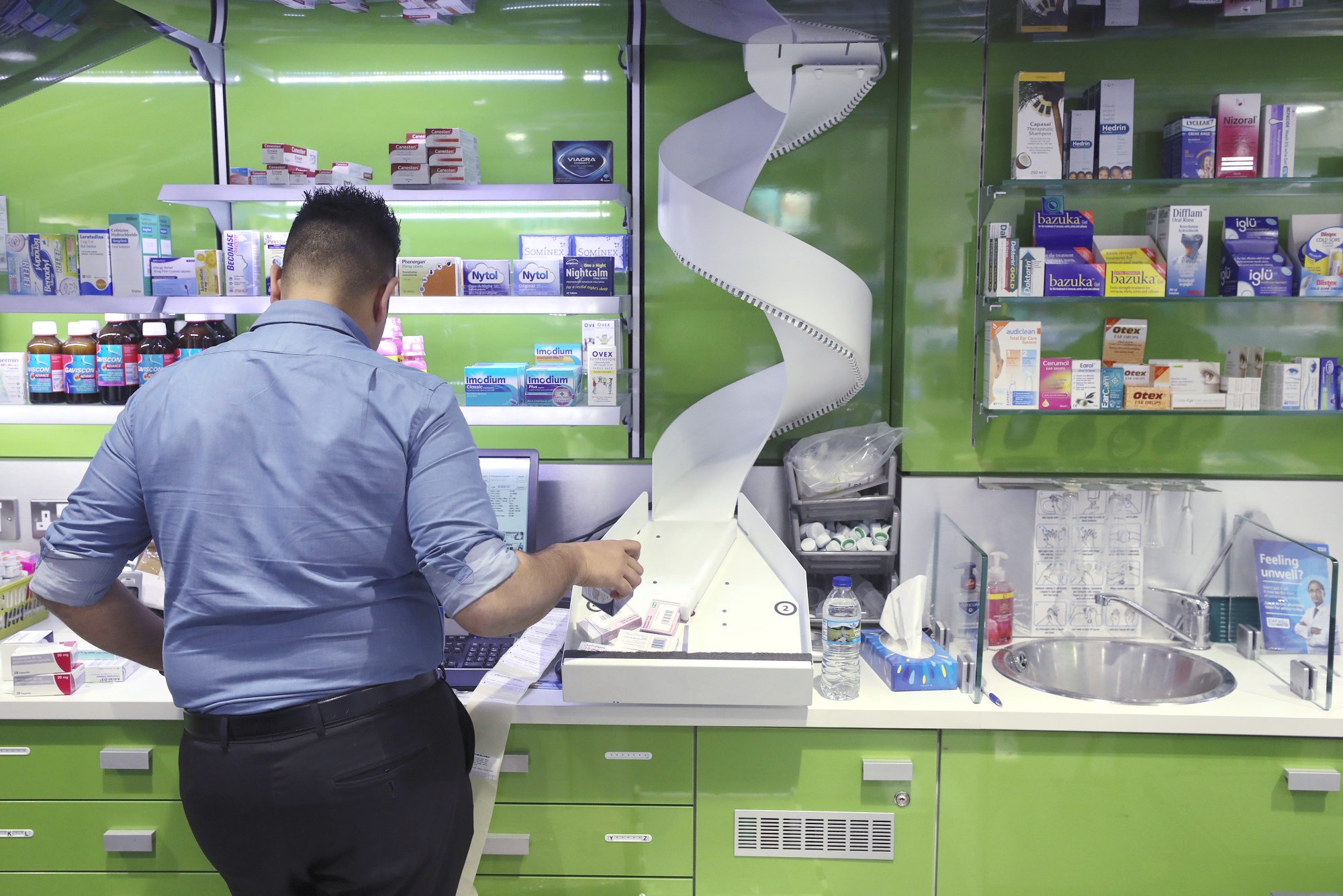 在英国肯特郡朗菲尔德的一家药店,一名药剂师正在填写订单。