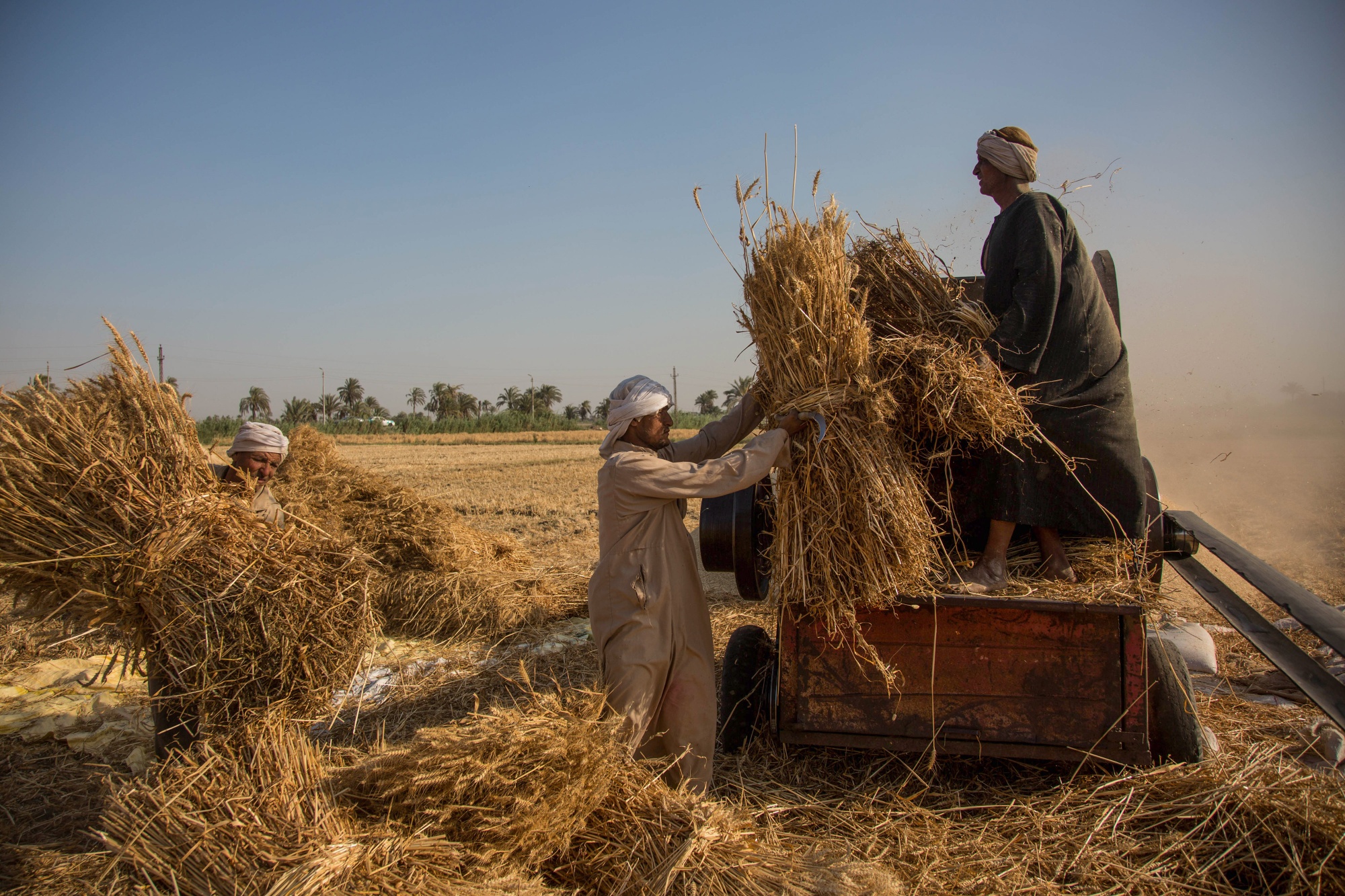 工人们在埃及法尤姆的拉赫玛村庄的农场上将收割的小麦投入脱粒机。