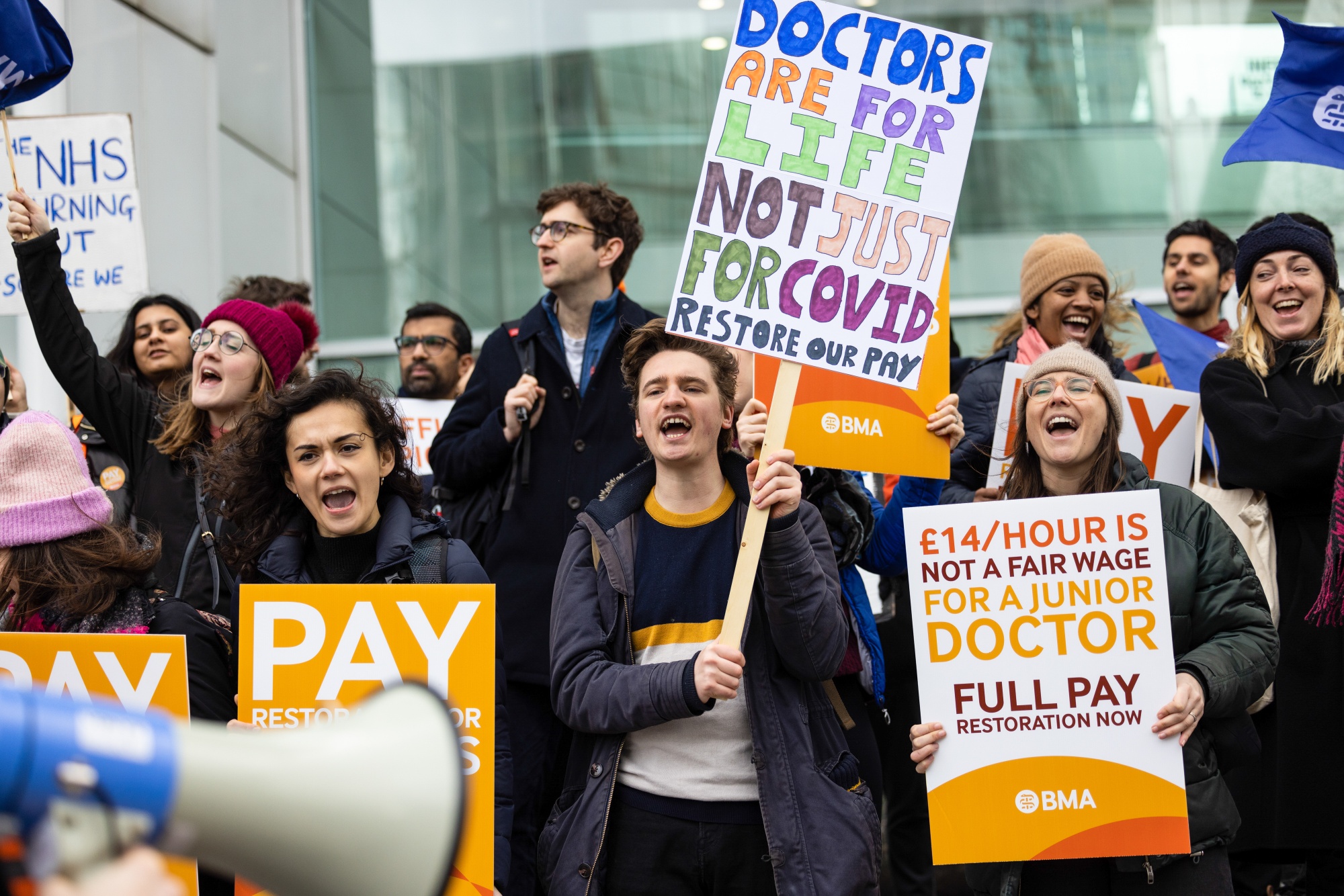 伦敦大学学院医院外的罢工中的初级医生,拍摄于3月13日。