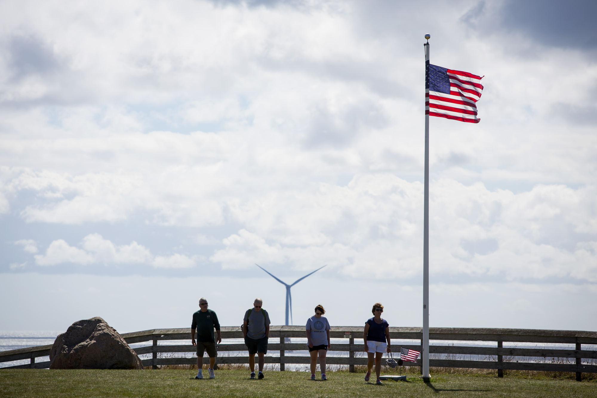 游客们在罗德岛布洛克岛附近的一座Ørsted风力涡轮机旁走过