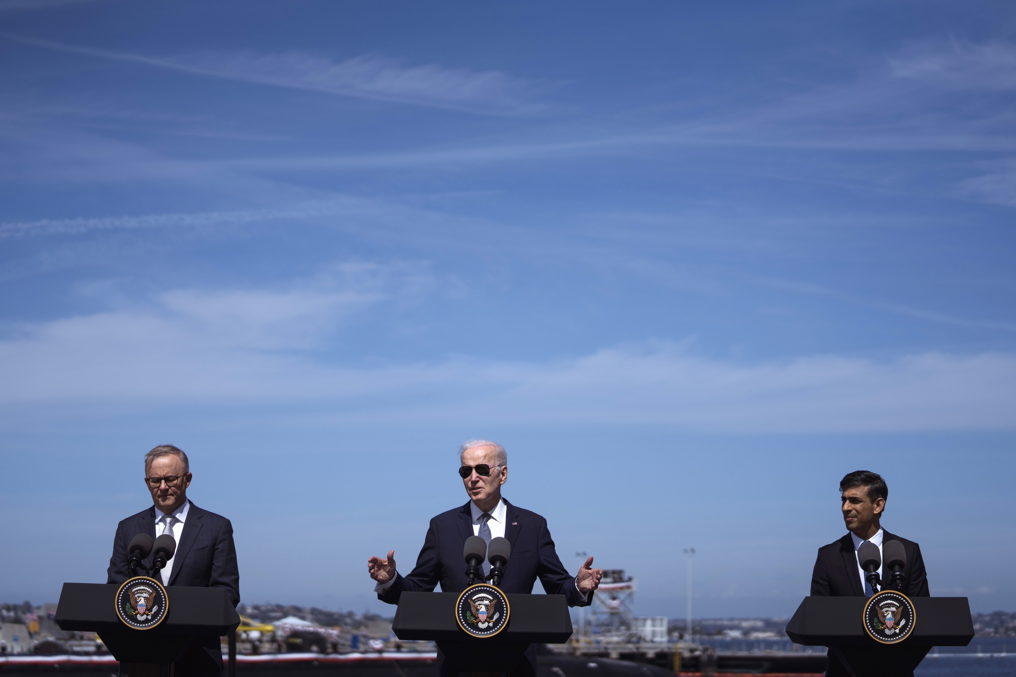 乔·拜登与安东尼·阿尔巴尼斯和里什·苏纳克于3月13日在圣地亚哥合影。摄影师:埃里克·泰耶/彭博社经过18个月的谈判,美国和英国领导人宣布了他们计划在未来30年向澳大利亚提供一支核动力潜艇舰队的细节,这是旨在应对中国在印太地区的军事扩张的雄心勃勃的奥库斯伙伴关系的一部分。但这对澳大利亚来说将是一个艰巨的价格标签 — 估计高达数千亿美元 — 并且在第一艘新舰艇准备就绪之前,这一努力将需要三个盟国大规模增加工业生产,这将在十年后实现。