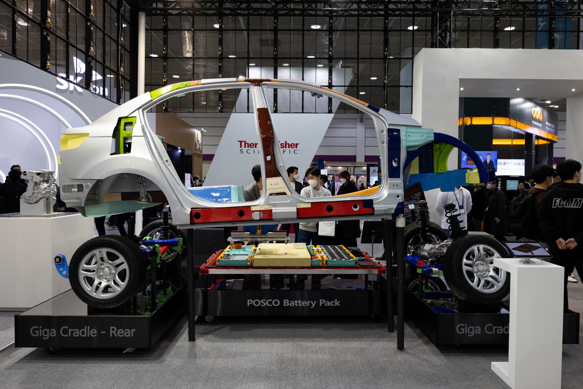 在首尔举办的InterBattery展览上展示的Posco Chemical电动汽车电池包。摄影师:SeongJoon Cho/Bloomberg浦项的钢铁巨头并没有袖手旁观。浦项集团旗下的电池部门Posco Chemical Co.于2022年4月在Ecopro工地对面动工建设一个3万吨产能的阴极工厂。总部位于首尔的GS Engineering & Construction Corp.计划斥资1,500亿韩元兴建一座电池回收工厂,今年开始运营。