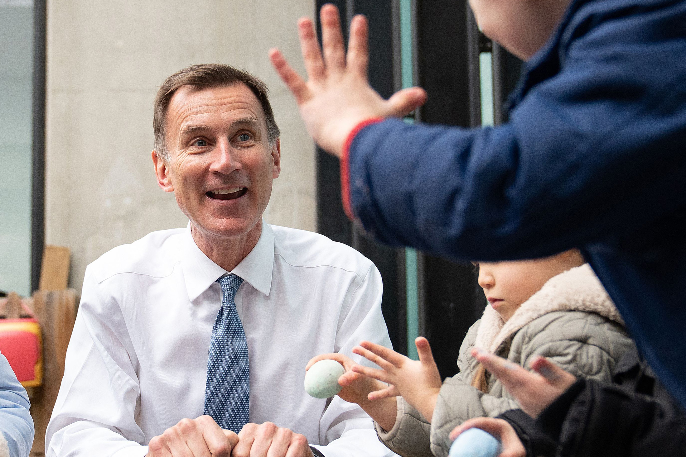 杰里米·亨特在2023年3月15日访问伦敦南部的Busy Bees Battersea托儿所时与孩子们见面。