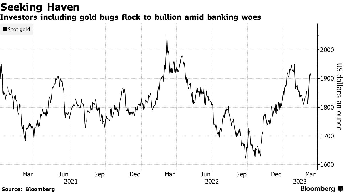 随着银行倒闭和相关金融动荡,比如瑞士信贷(Credit Suisse)股价暴跌后一位主要股东排除向这家瑞士银行提供额外援助,更多美联储政策收紧的风险可能会推动黄金创下新高,彭博智库策略师迈克·麦克隆(Mike McGlone)周二在一份报告中表示。