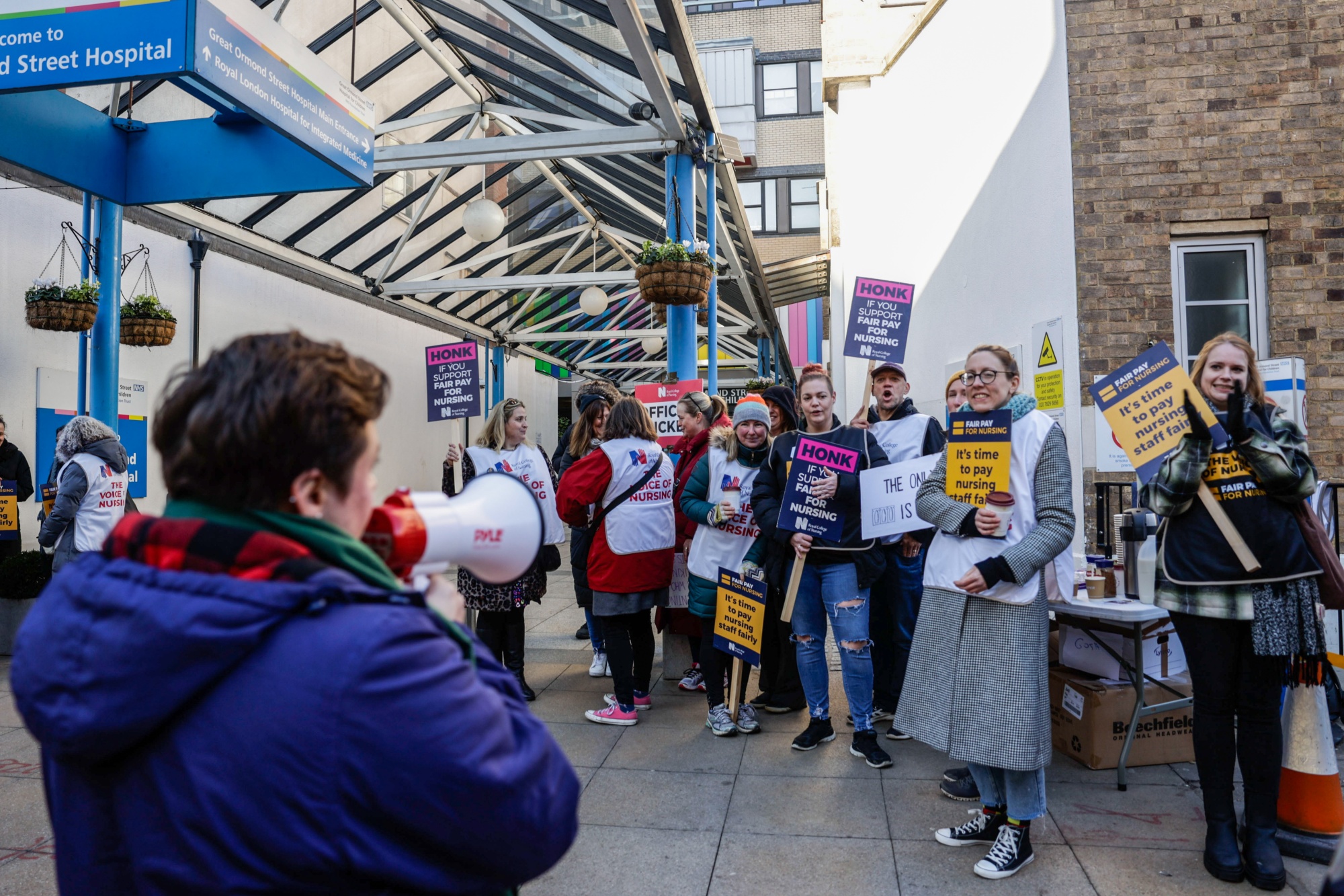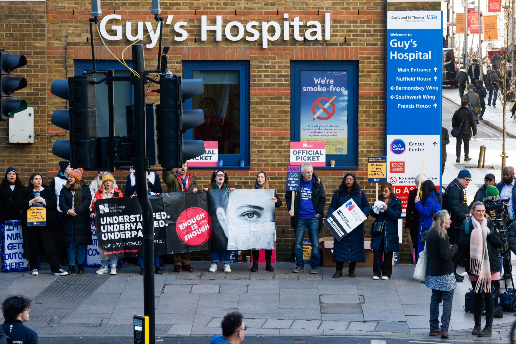 二月份在伦敦举行罢工行动的护士们。来源:彭博社RMT运输工会领袖米克·林奇(Mick Lynch)周四早些时候表示,解决NHS的争端可能“为其他行业的解决奠定基调。”