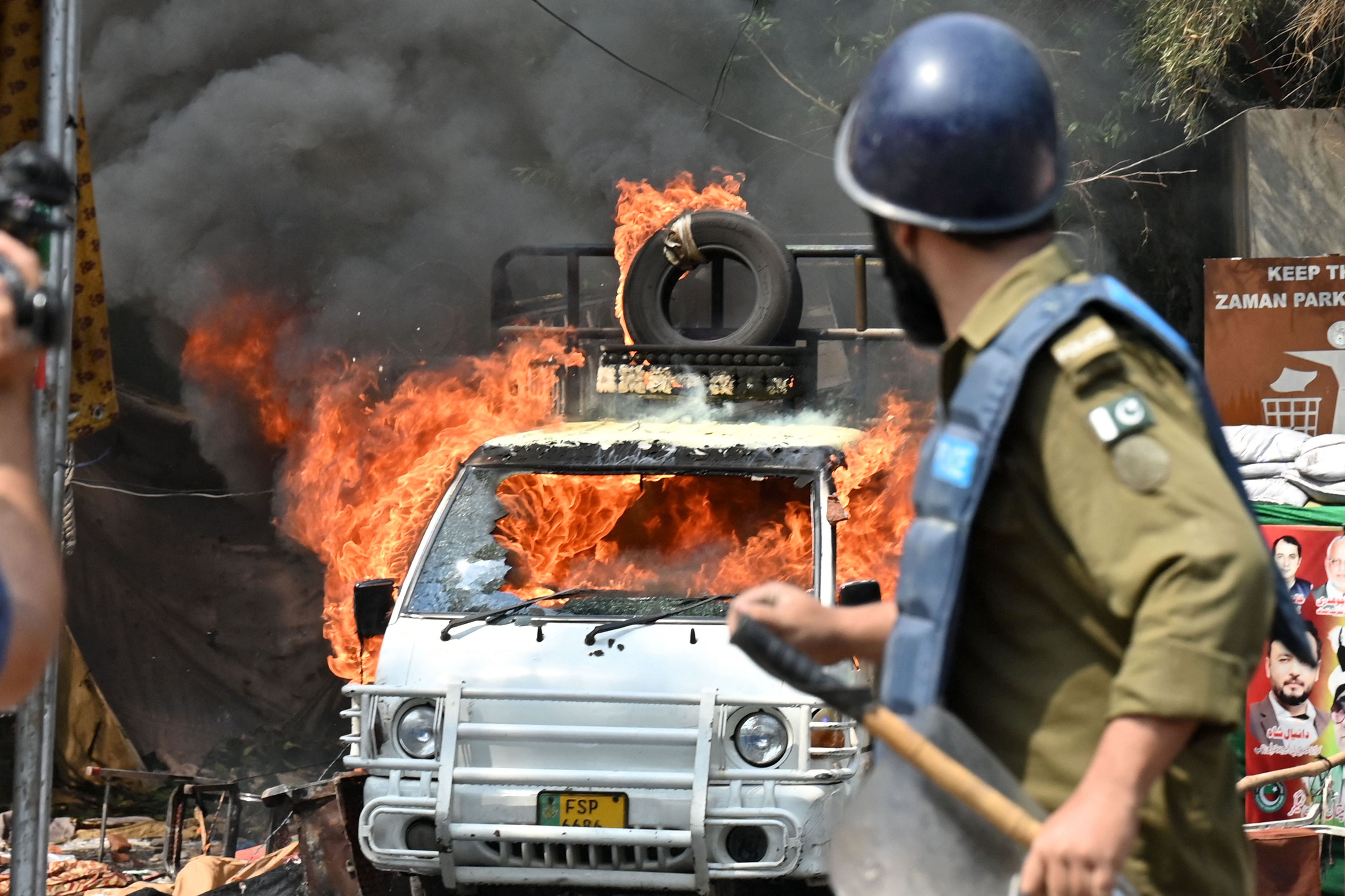 3月15日,在拉合尔伊姆兰·汗支持者和防暴警察之间发生冲突时,一辆车着火。摄影师:阿里夫·阿里/法新社/盖蒂图片社“我们接受了国际货币基金组织设定的非常严格的条件,”谢里夫在被问及协议延迟时说。“我希望工作层面协议将很快签署,并将提交给国际货币基金组织董事会。”