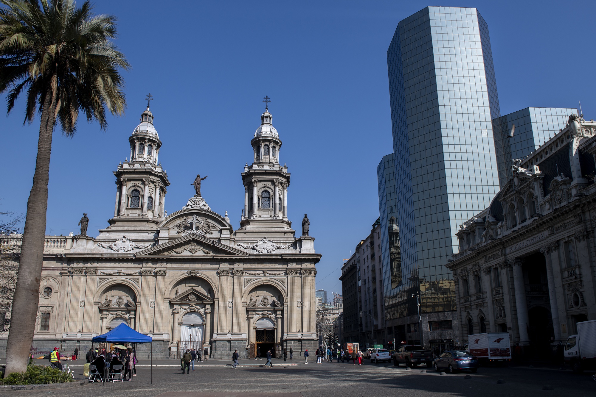 在2021年9月2日星期四,智利圣地亚哥的阿尔马斯广场上的行人。