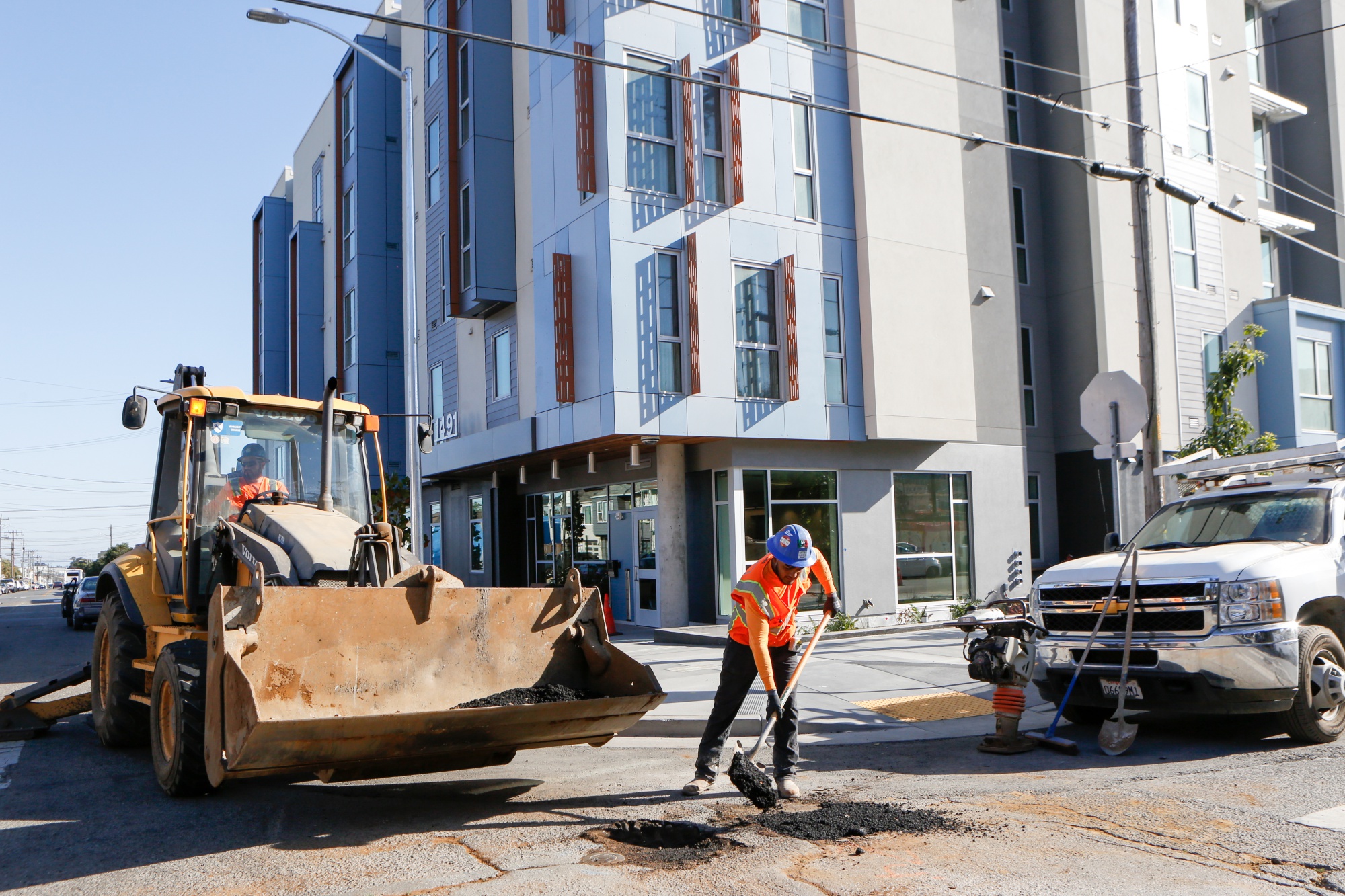承包商在旧金山一处2019年完工的住房改造项目外填补街道上的洞,该地区的租金中位数为3650美元,房屋的中位售价超过120万美元,据Zillow称。