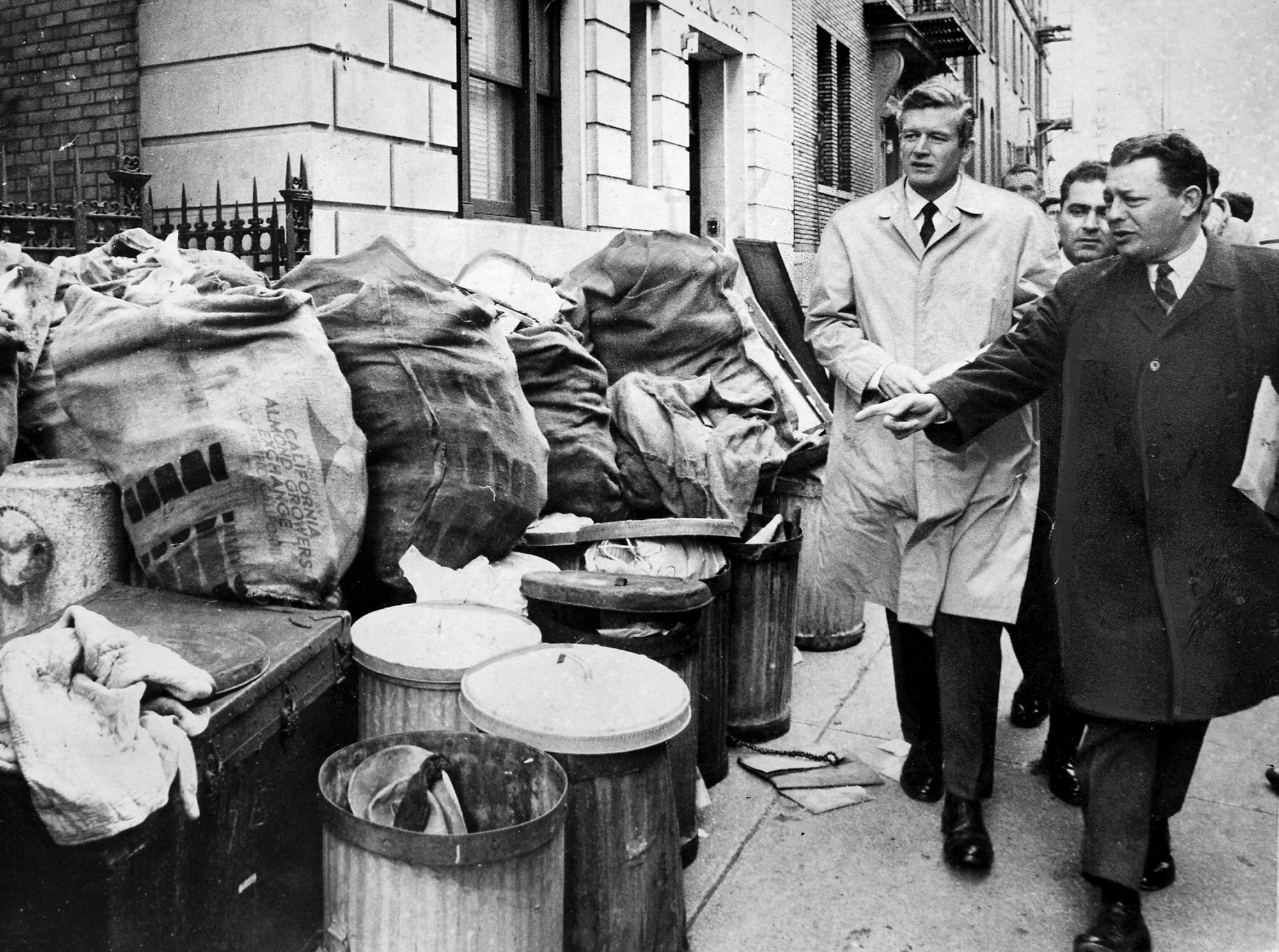 市长约翰·林赛(左)在1968年2月3日视察纽约市堆积的垃圾。摄影师:纽约每日新闻档案馆通过盖蒂图片社与此同时,这场罢工加深了市长约翰·林赛和纽约州州长纳尔逊·洛克菲勒之间的政治纷争,两人都因此事受到了一定程度的公众指责,并加剧了纽约市正在陷入无法治理的混乱的普遍感觉 — 这一点在1975年,1981年和1990年的进一步环卫纠纷中得到了强调。