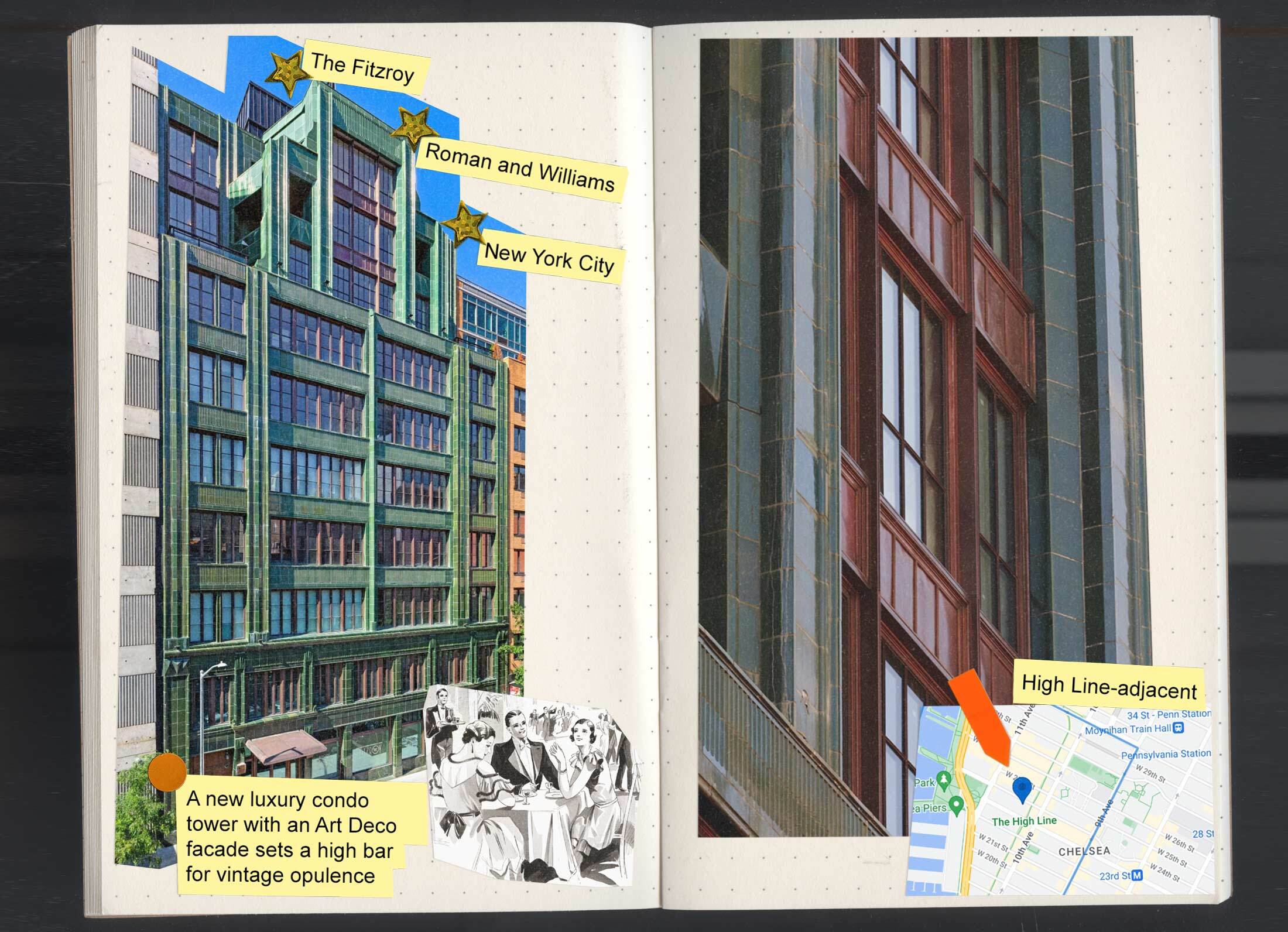 对于罗曼和威廉姆斯公司的建筑师们来说,纽约市任何一次漫步的主要吸引力是曼哈顿街道两旁的装饰艺术建筑群:光亮的、百年历史的建筑,其光泽从未因岁月而褪色。20世纪20年代的建筑设计成为了菲茨罗伊的灵感来源,这是一座坐落在切尔西西24街中段的10层住宅塔楼。