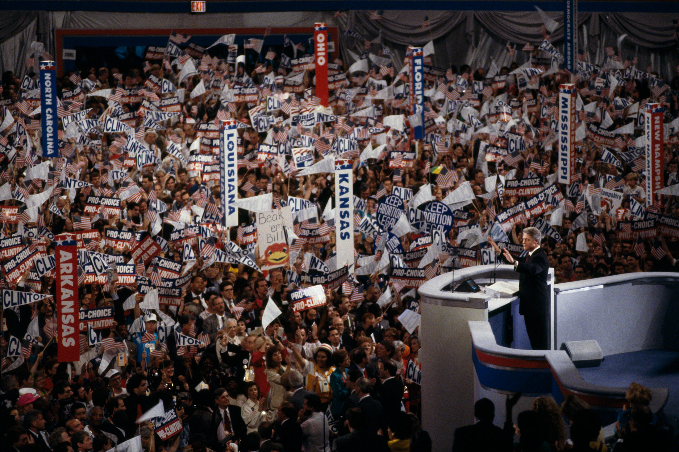 比尔·克林顿在1992年的纽约大会上接受了民主党候选人提名。摄影师:布鲁克斯·克拉夫特/赛格玛/盖蒂图片社纽约的申办背后有资金和明星力量支持。主办委员会包括纽约大都会队老板史蒂夫·科恩、尼克斯队和游骑兵队老板詹姆斯·多兰、蒂什曼斯派尔的罗伯特·斯佩耶和演员罗伯特·德尼罗。女演员胡比·戈德堡配音了一部八分钟的宣传视频,主要关注酒店客房的可用性、文化景点和美食场所。