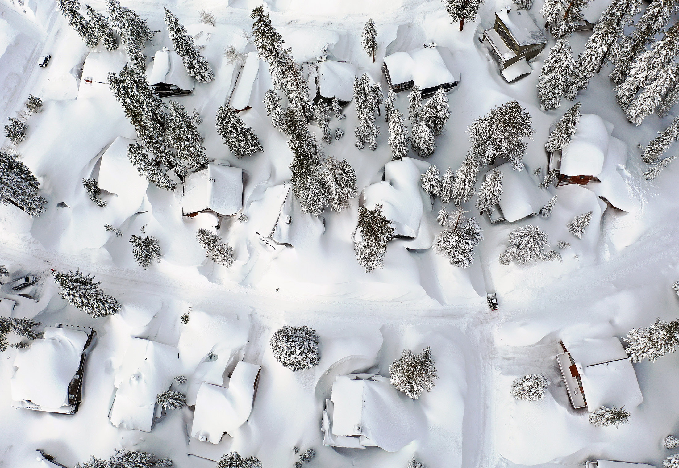 内华达山脉的雪埋住了家园,这是加利福尼亚州马莫斯湖在3月12日遭受暴风雪后的景象。