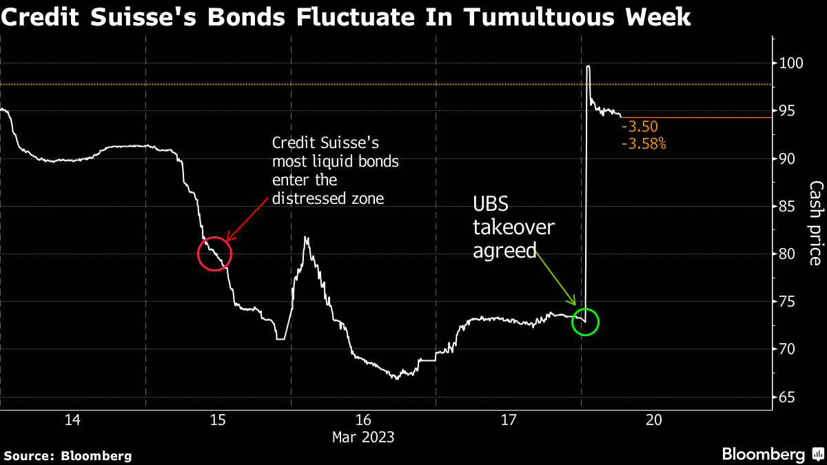在 Al Khudairy 的言论在彭博电视台播出后的两个小时内,该银行最流动的债券在欧元上下跌了9到10分。截至当天结束,许多证券下跌了多达30分,这几乎是投资级债务领域中前所未有的跌幅,引发了对瑞士信贷借贷能力和避免违约的担忧。