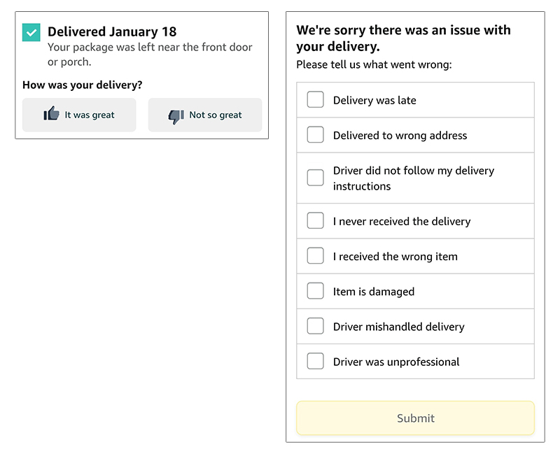 当亚马逊顾客给司机打了个差评时,左边会弹出一个可勾选选项列表,右边。亚马逊并不是唯一被指控让种族偏见影响其运营的科技公司。优步科技公司被控据称根据顾客对少数族裔司机的评分而解雇他们。去年三月,一位联邦法官表示原告未能证明歧视,但给予他们修改起诉的时间。Airbnb公司多年来一直在努力阻止房东歧视寻求租用度假物业的非裔美国人。在一名黑人提起诉讼指控这种偏见之后,该公司实施了一系列措施,包括防止房东在接受业务之前看到潜在租客的照片。