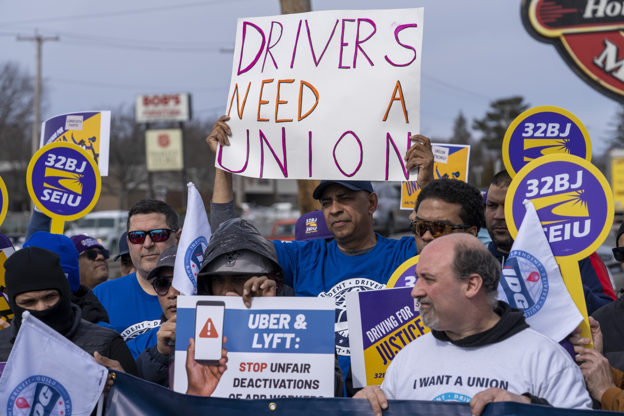 优步和Lyft司机于3月1日在马萨诸塞州索格斯集会,要求加入工会。摄影师:M. Scott Brauer/Bloomberg代表一群优步科技公司、Lyft公司和其他应用服务的团体对拜登总统提名的劳工部长提出了关于工人分类规则立场的担忧。
