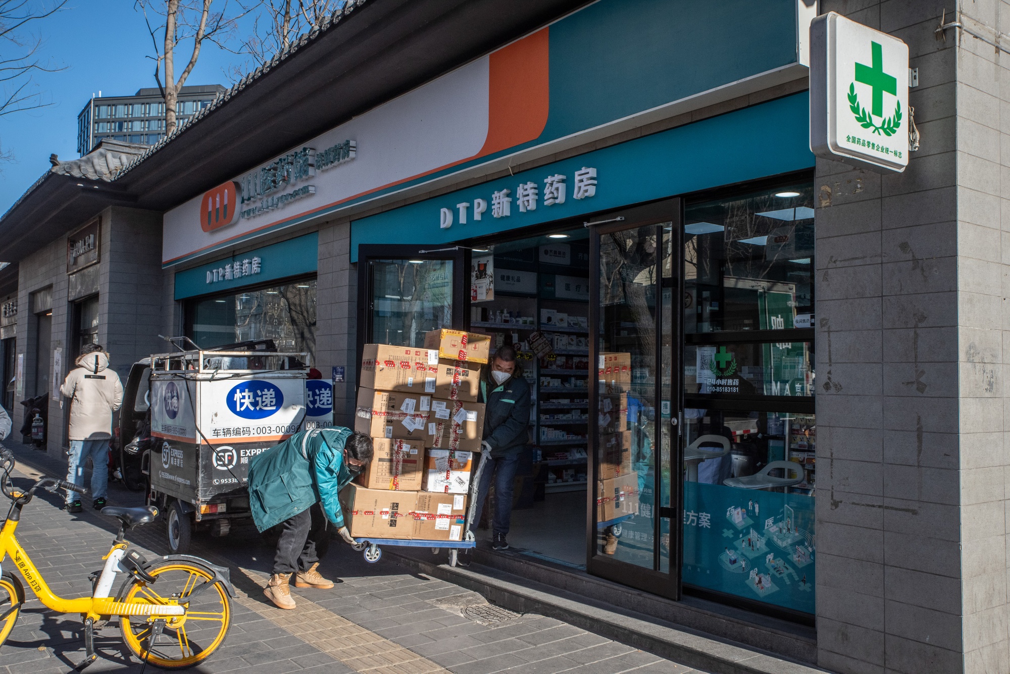 工人们在2022年12月22日星期四将包裹送到了北京的一家药店。