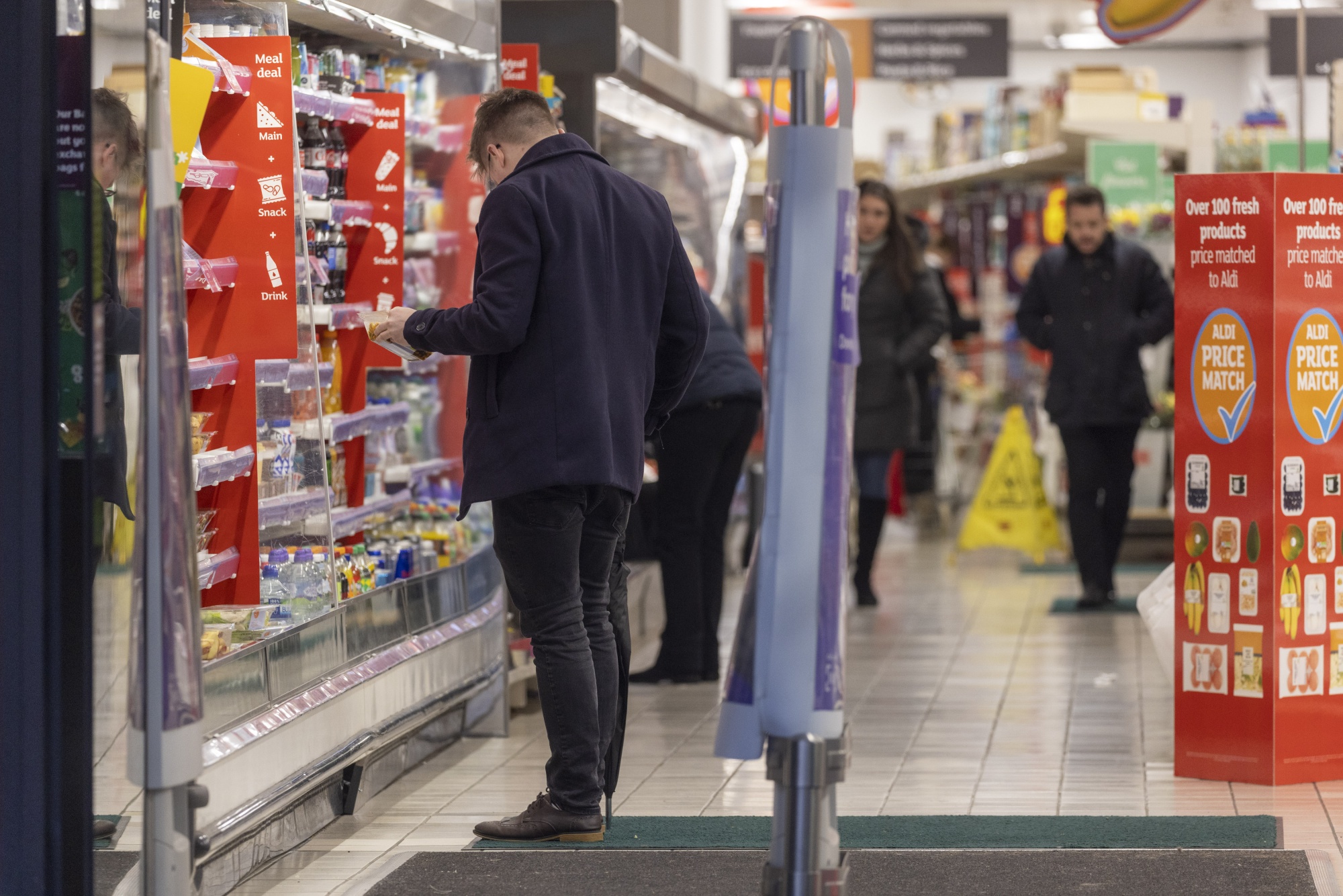 一名购物者在英国一家Sainsbury超市内浏览商品。