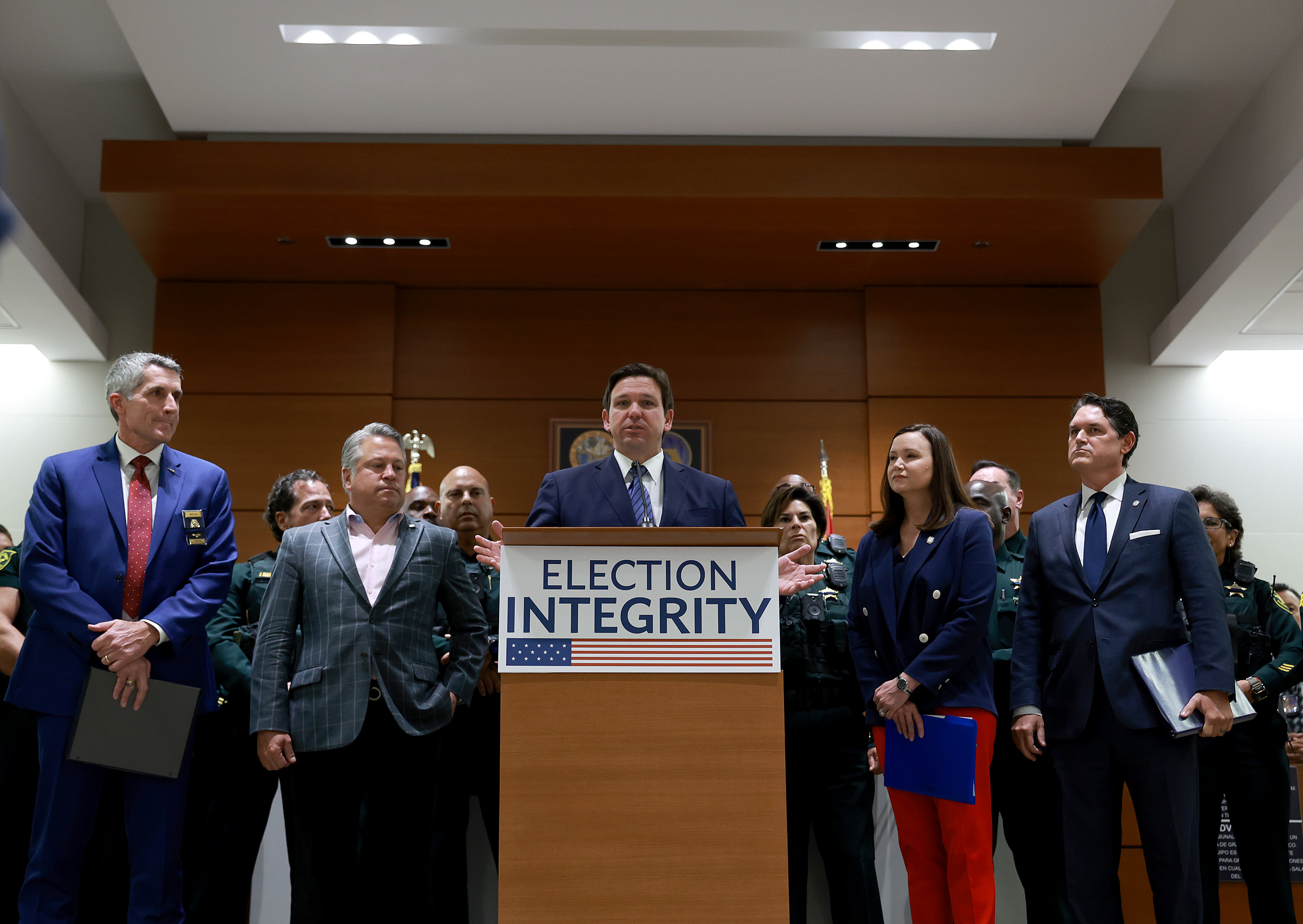 就在去年8月初选的前几天,德桑蒂斯召开了一场新闻发布会,身边站着选举警察,宣布逮捕了20名前重罪犯,罪名是非法投票,这本身是一项可判处最高五年监禁和5000美元罚款的三级重罪。批评人士指责这些公告的时机是出于政治动机。