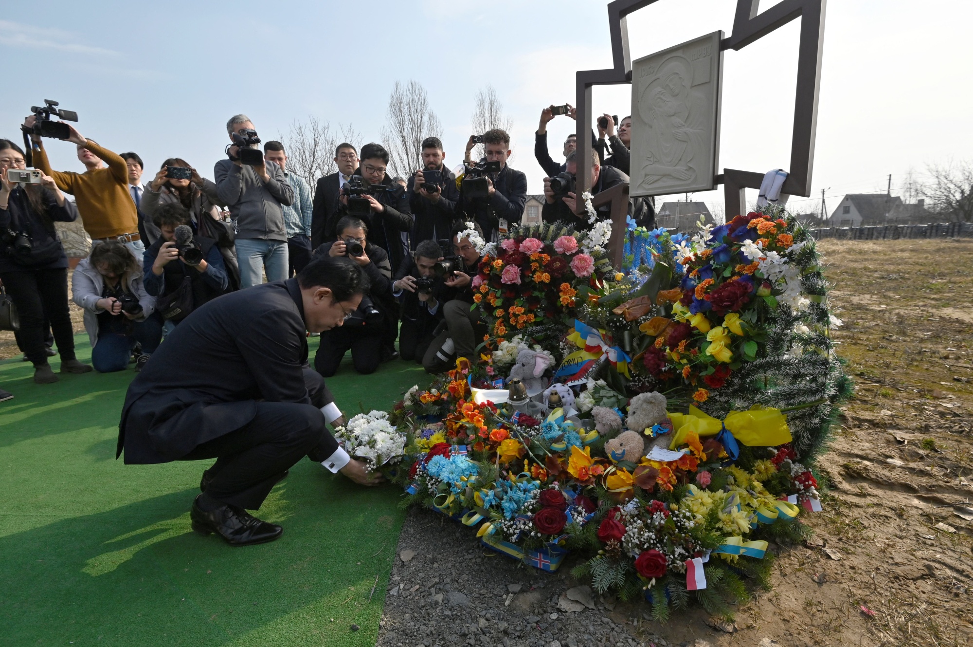 岸田文雄在乌克兰布查的大规模坟墓遗址向遇难者致敬。摄影师:谢尔盖·丘扎夫科夫/法新社/盖蒂图片社岸田在与泽连斯基在基辅举行的新闻发布会上表示:“日本将在和平恢复之前一直支持乌克兰。”