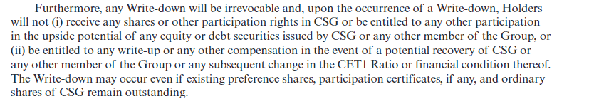 持有人最大的烦恼之一是,他们被置于股东之后,许多其他欧洲监管机构也同意他们的观点。与欧盟和英国银行发行的其他AT1票据不同,招股说明书似乎允许发生这种情况: