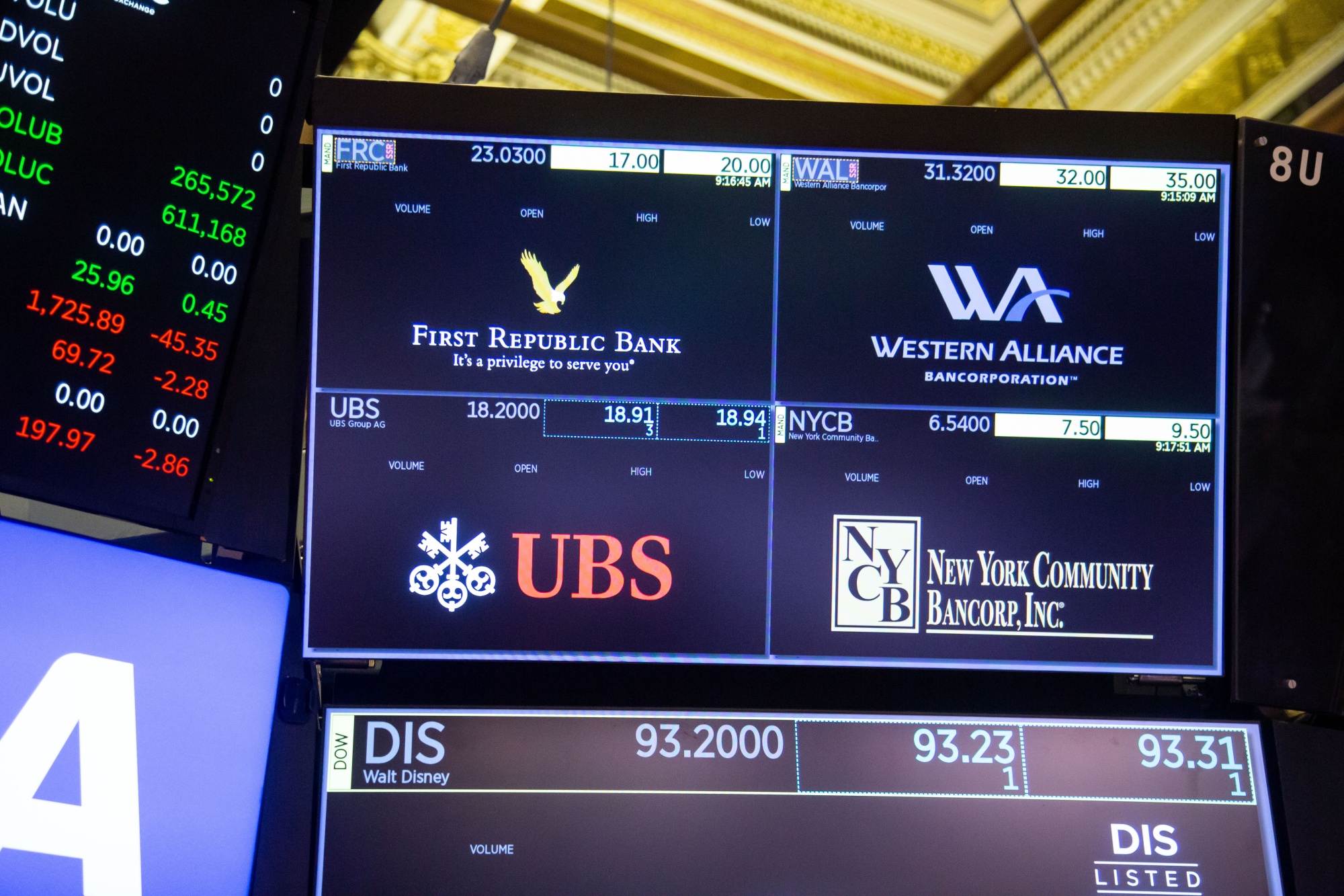 First Republic Bank、Western Alliance Bancorp、UBS和纽约社区银行的标志于周一出现在纽约证券交易所的地板上。摄影师:Michael Nagle/Bloomberg - Alecta,瑞典最大的养老基金,以超过7.2亿美元的亏损出售了其在First Republic的所有股份。该基金上周表示,预计将完全核销其在SVB和Signature Bank的投资,成本为11亿美元。