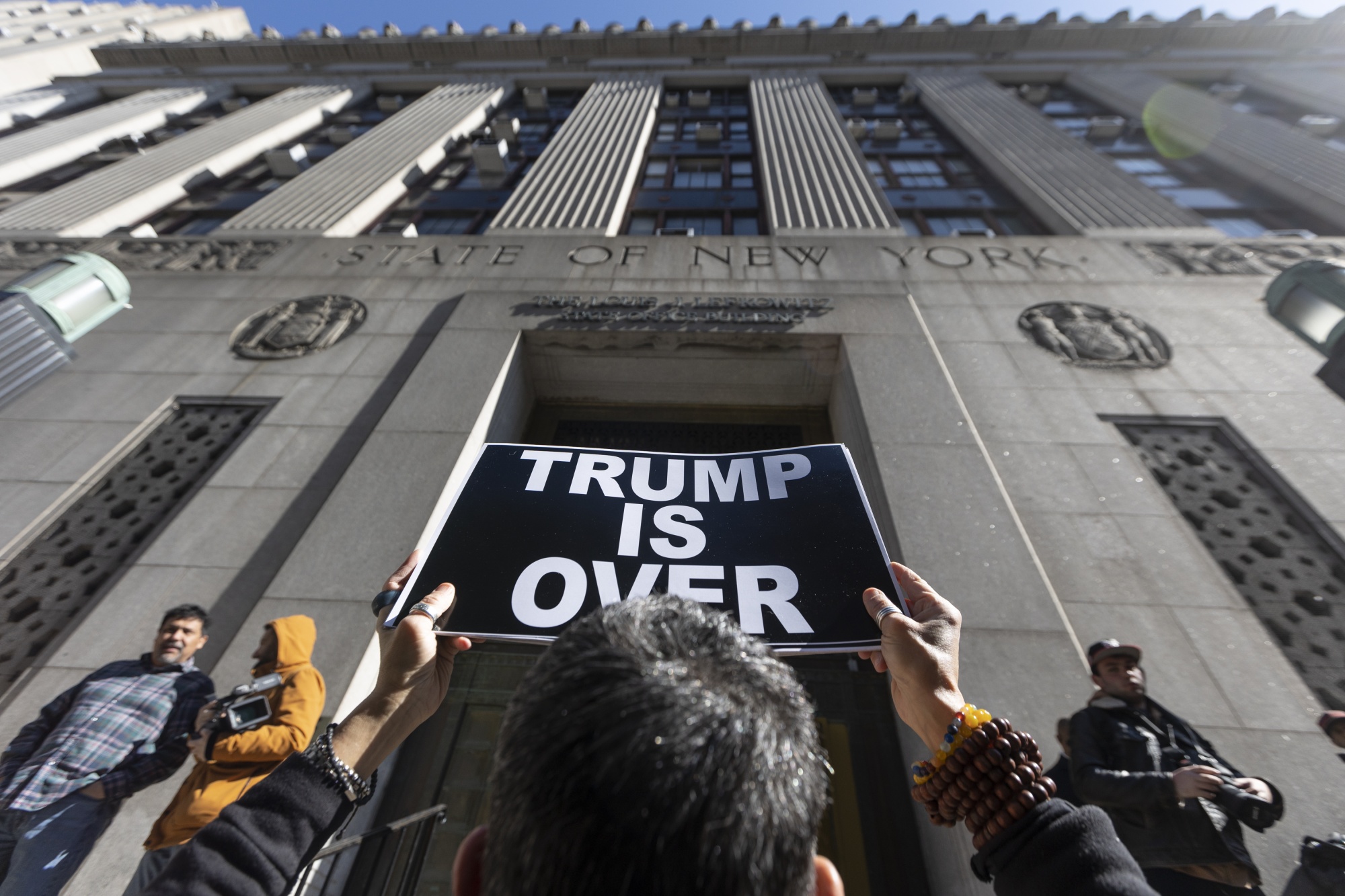 一名抗议者周一在纽约曼哈顿地区检察官办公室外举着标语牌。