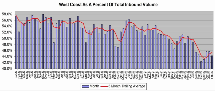 这个合同季节对于劳资谈判和运价而言都很混乱,加剧了市场份额从南加州转移到东部和墨西哥湾海岸的趋势。洛杉矶港口的集装箱吞吐量从去年同期的疫情时代纪录下降了43%,长滩港口下降了32%。