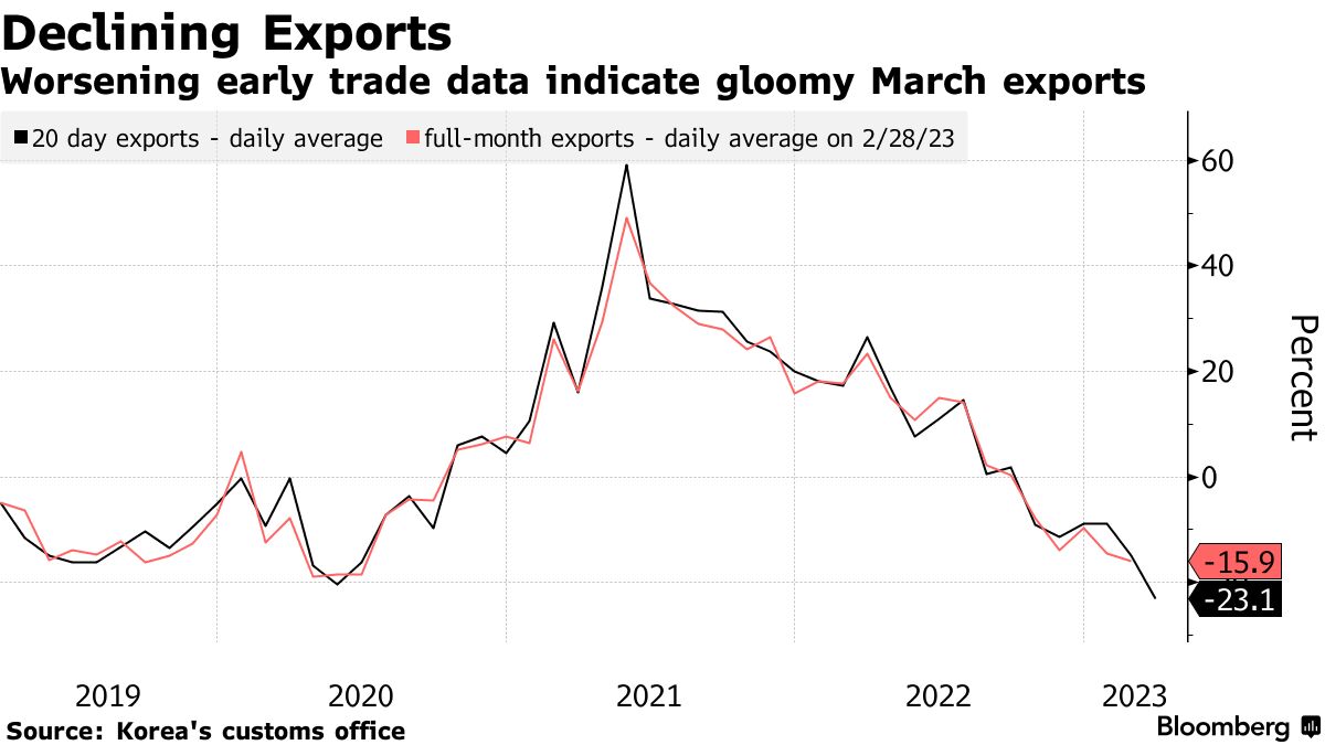 芯片暴跌 | 韩国的早期贸易数据显示,由于全球对半导体的需求仍然疲弱,中国的重新开放尚未带来任何提振,出口持续下滑。海关办公室周二表示,三月头 20 天的日均出货量较去年同期减少了 23%,而总出口下降了 17%,芯片销售暴跌了 45%,对华出口下降了 36%。