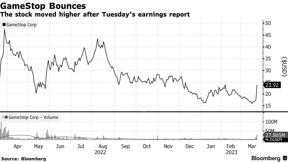 摄影师:Yuki Iwamura/BloombergGameStop Corp.股价飙升高达53%,创下两年来最大涨幅,此前该公司在第四季度意外盈利并超出分析师对营收的预期。