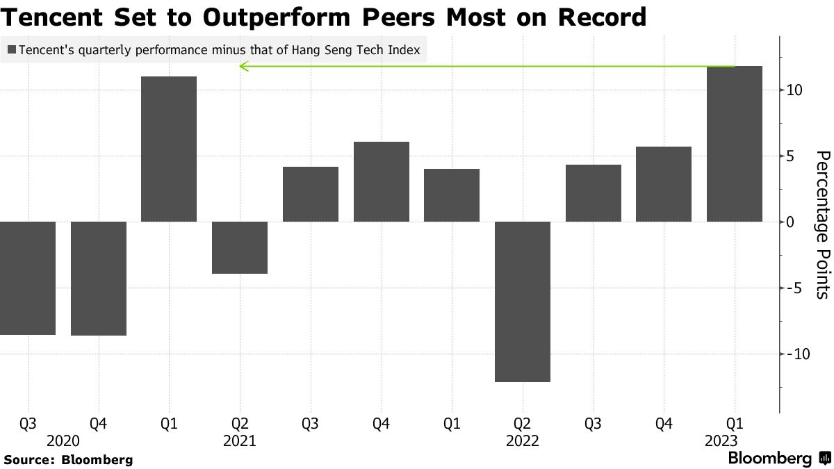 这家游戏和社交媒体领导者的股价有望在恒生科技指数推出以来表现最佳,本季度涨幅达8.3%,即使阿里巴巴集团控股有限公司和京东公司仍处于亏损状态。腾讯的涨势很大程度上是受到未来销售额预期和相信北京将兑现支持私营部门的承诺的推动。