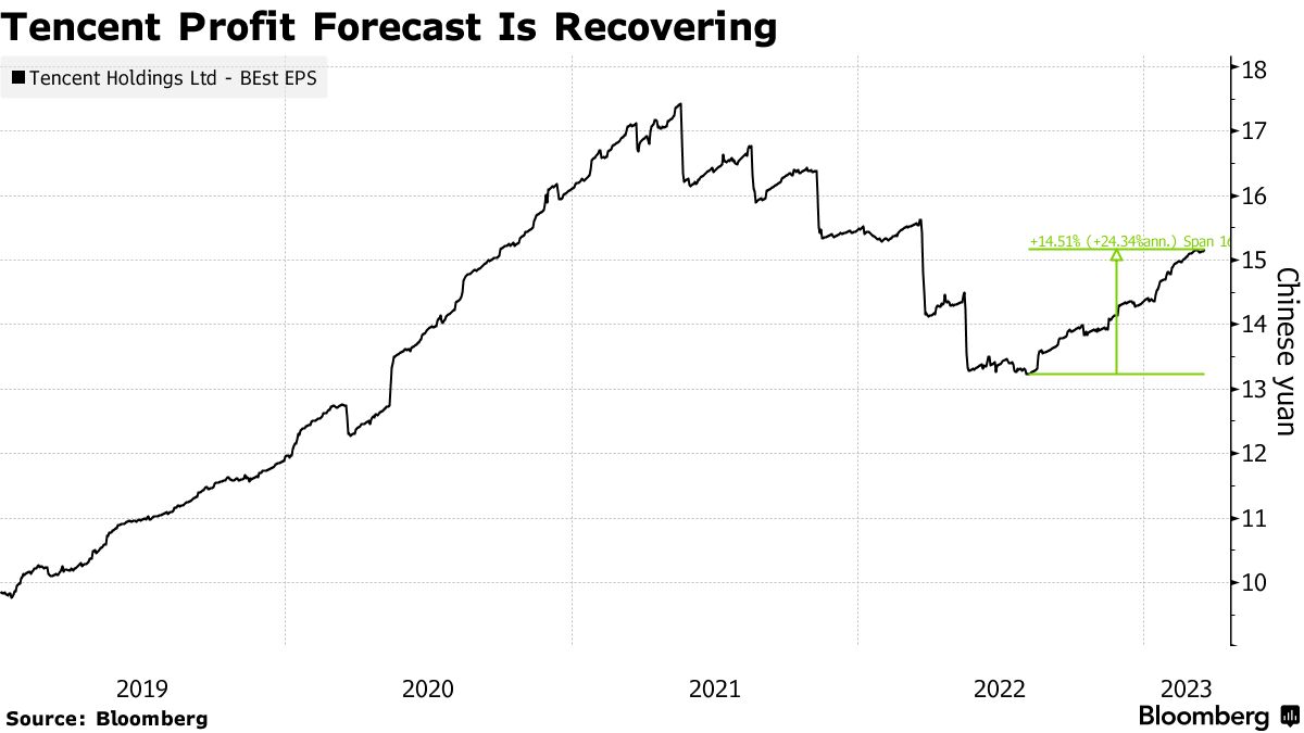 根据分析师在周三发布财报之前的估计,腾讯在2022年最后三个月的营收可能微弱增长了0.2%,这是继连续两个季度萎缩之后的增长。预计增长将在三月季度加速至6.7%。
