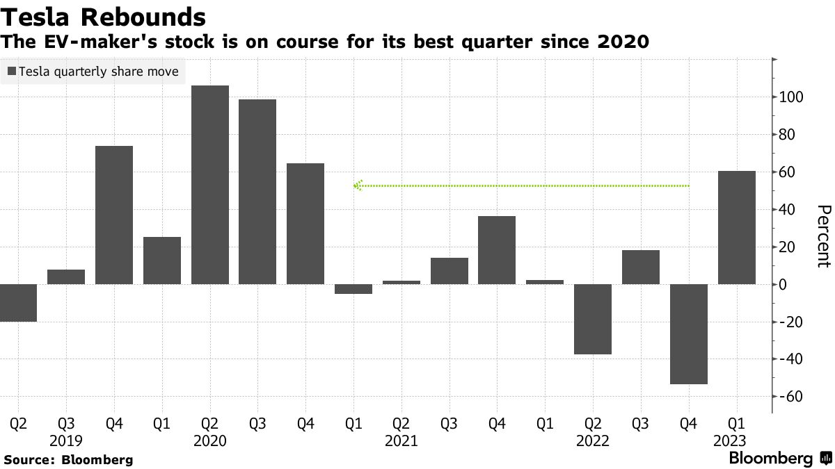 特斯拉股价周三上涨了0.5%,延续了这一涨势,此前这家电动汽车制造商的债券获得了穆迪投资者服务的评级提升。穆迪成为第二家授予特斯拉投资级评级的信用评级机构,继标普全球评级在去年十月做出类似举措后。股票的涨势将其本季度的涨幅扩大到61%,使特斯拉有望实现自2020年最后三个月64%的涨幅以来的最佳季度。