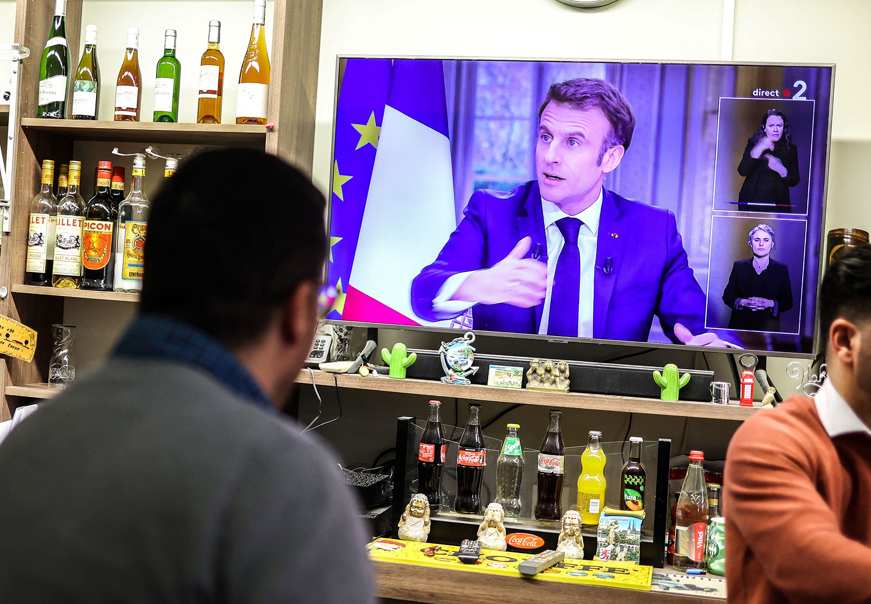 观众们在法国西南部图卢兹的一家餐厅里收看埃马纽埃尔·马克龙的电视采访,时间是3月22日。
