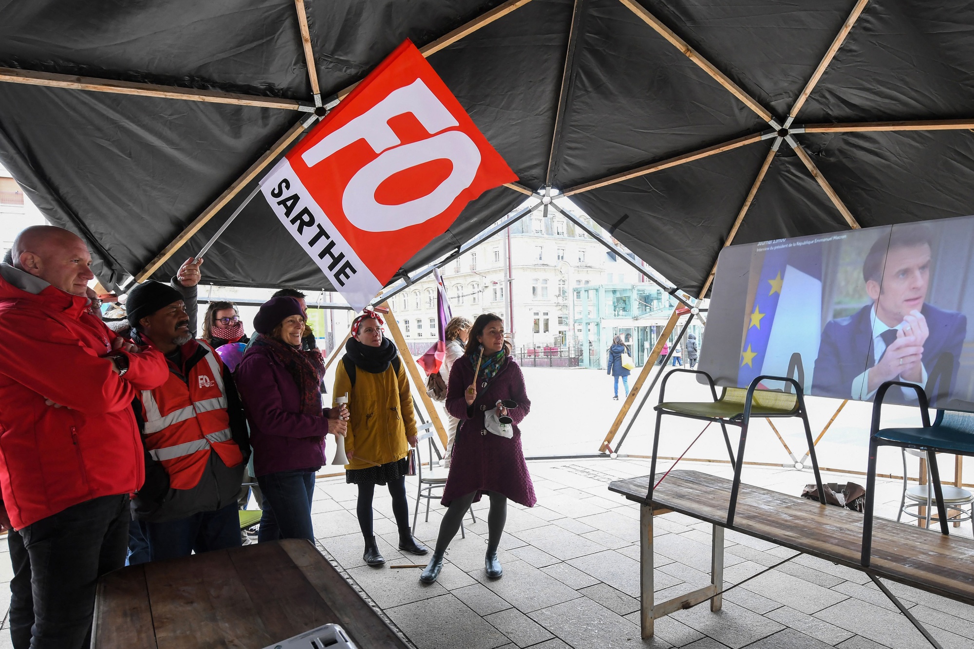 抗议者在3月22日法国勒芒观看埃马纽埃尔·马克龙的电视采访时的反应。摄影师:让-弗朗索瓦·莫尼耶/法新社/盖蒂图片社马克龙表示,人们之所以愤怒并不仅仅是因为养老金改革,还提到了失业问题,并补充说,他正在努力找到让公司进行股份回购的方式,以让更多利润分配给工人。