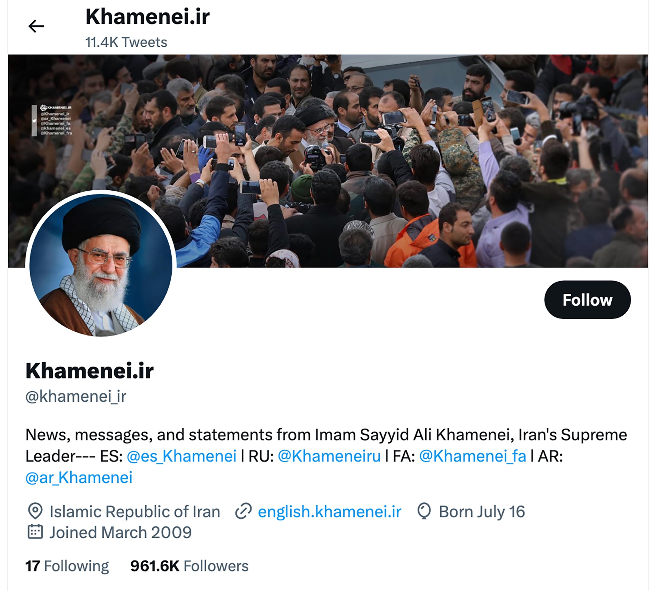 一条关于社交媒体和伊朗的推文。来源:Rumi Parsa/Twitter当这些平台拒绝采取行动时,他提起了诉讼。这起案件在加利福尼亚州提起,声称通过让哈梅内伊和其他伊朗官员使用他们的平台,这些社交媒体公司正在为违反制裁的政权提供服务。该案还声称,他们违反了自己的使用条款,因为允许阿亚图拉发布反犹太主义仇恨言论和暴力呼吁。@khamenei_ir账号——以及其他用阿拉伯语、法语和西班牙语发布的账号——此前曾发表可以被解读为直接针对以色列和美国的威胁,以及针对犹太人的攻击的声明。该账号还被指控煽动了去年八月在纽约州肖托夸发生的对萨尔曼·鲁什迪的暗杀企图。2019年,它重申了前任最高领袖阿亚图拉霍梅尼于1989年发布的针对鲁什迪的死亡令,原因是鲁什迪出版了他的小说《撒旦诗篇》。在那条推文之后,Twitter暂时限制了该账号的发布能力,但哈梅内伊仍然留在了这个平台上。