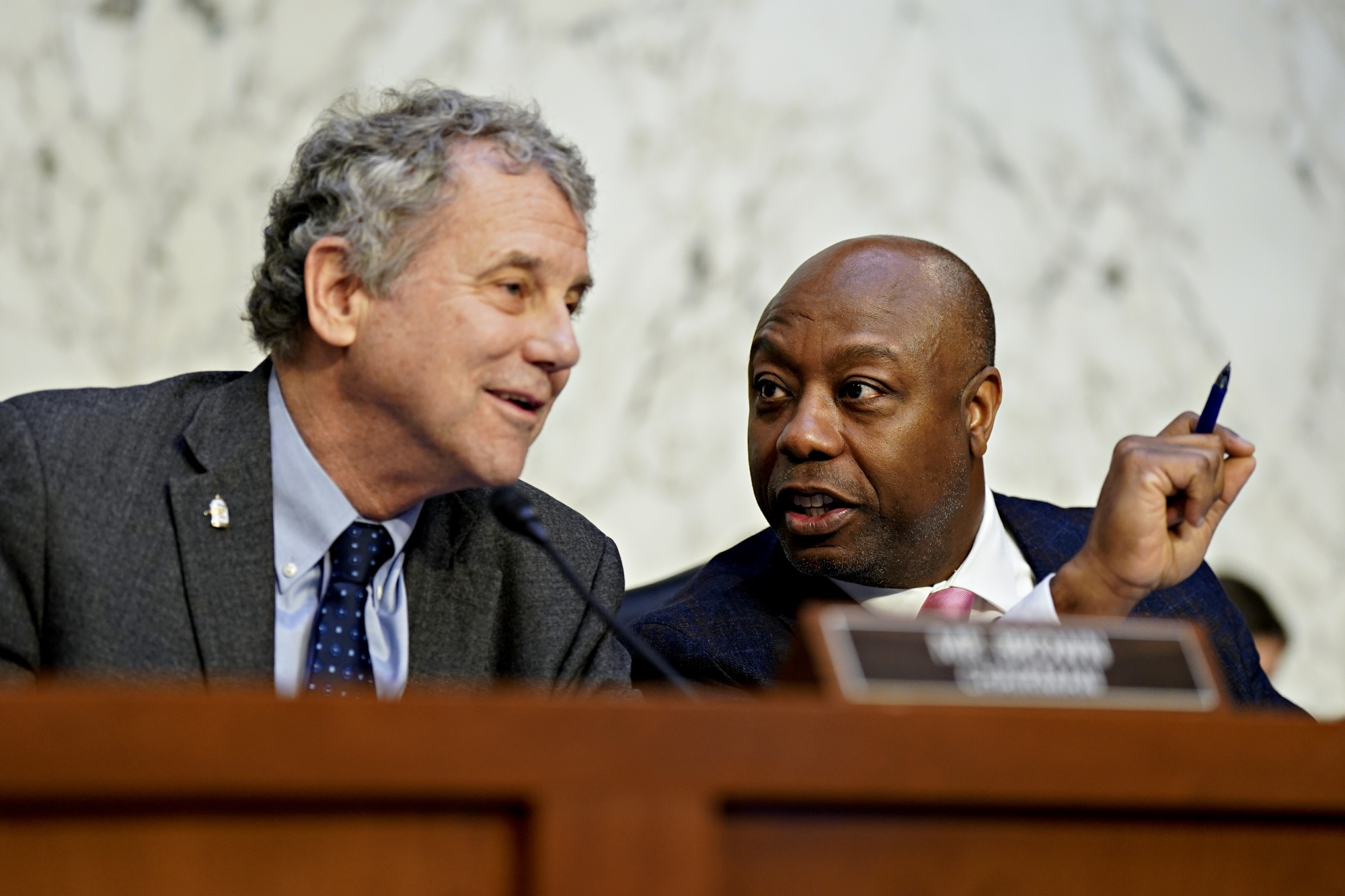 参议员谢罗德·布朗和蒂姆·斯科特在3月7日银行委员会听证会上。摄影师:阿尔·德拉戈/彭博社提高上限的想法似乎得到了多数党领袖查克·舒默的暂时支持,他表示提高25万美元的限额是“一个严肃的提议”,将“加强较小的银行”。财政部长珍妮特·耶伦周三告诉参议员,支持将所有银行存款都用联邦存款保险支持的做法“不是我们考虑过的”。