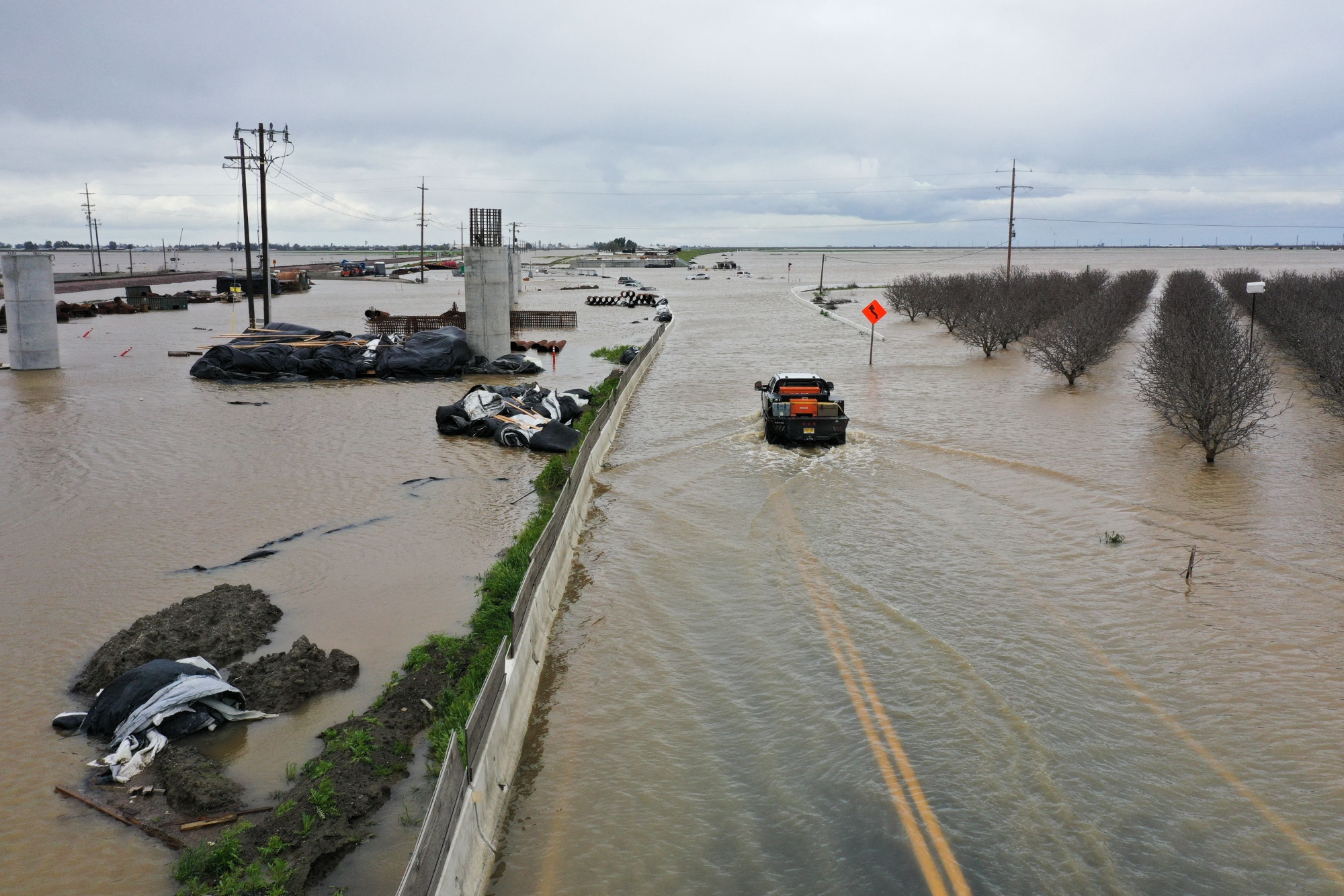 3月21日,加利福尼亚州图拉里县图勒河沿线的中央谷地农田被淹没的道路。摄影师:帕特里克·T·法伦/盖蒂图片社“这是一场猛烈的、突然的风暴,”加州大学洛杉矶分校的气候科学家丹尼尔·斯温说。“我们看到的影响可能类似于强热带风暴或弱飓风。”