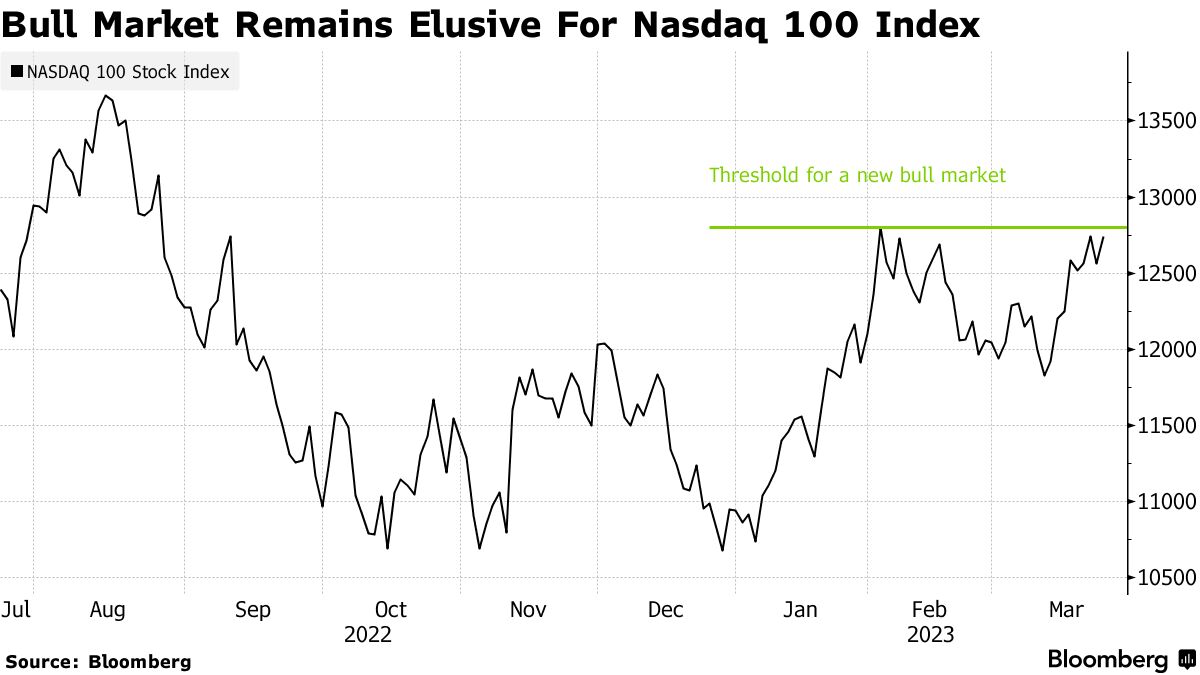 纳斯达克100指数周三再次接近创立一个新的牛市,但随后财政部长珍妮特·耶伦和美联储主席杰罗姆·鲍威尔的评论使这个科技股重要指数下跌。该指数今年已多次尝试收盘比12月低点高出20%,但始终未能成功。该指数周四上涨超过1%。