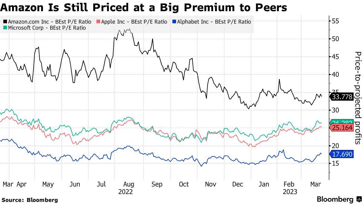 尽管亚马逊的估值与其他大型科技公司一起显著下降,但根据彭博社编制的数据,它仍然是远远最昂贵的,预计未来12个月的利润为34倍。而此时其增长急剧放缓:分析师们估计,今年收入将仅增长8%,而过去五年的平均增长率为24%。