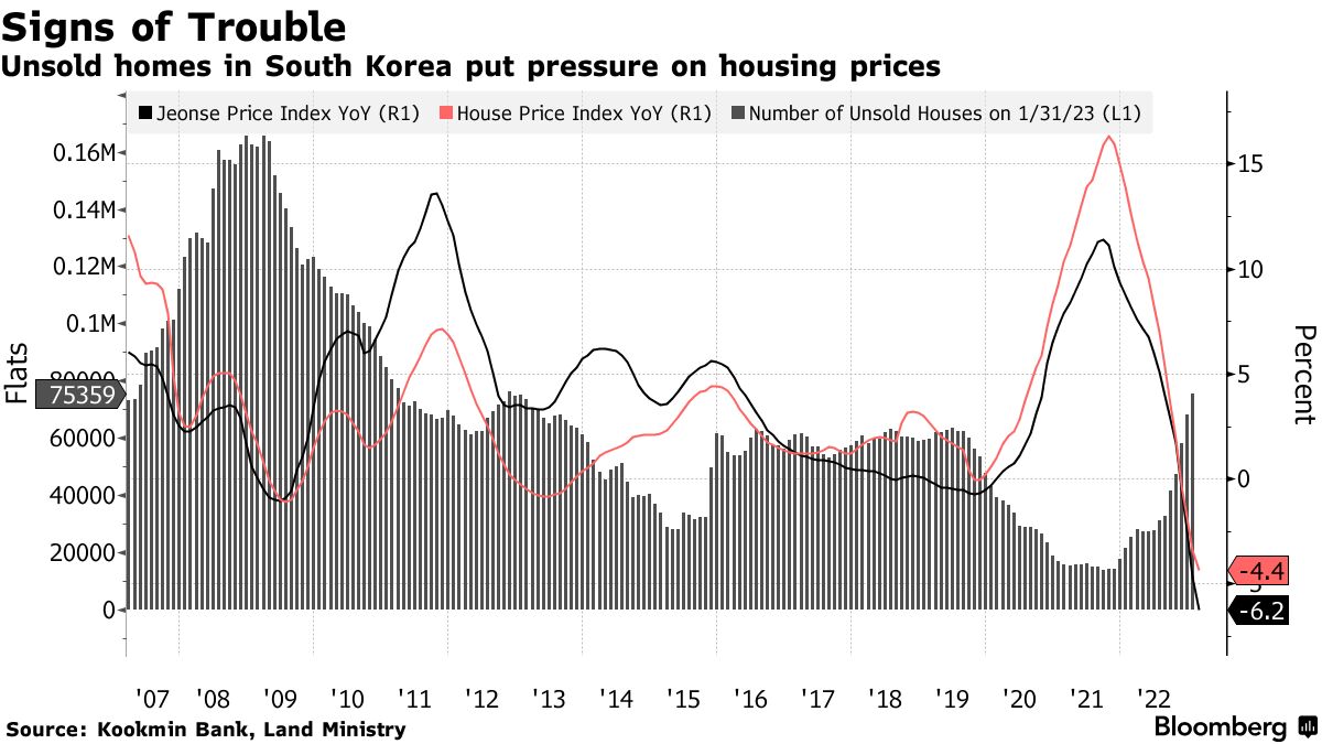 2月份,房价较去年同期的高位下跌了4.4%。根据韩国人居环境研究院的数据,如果房价下跌10%,大约四分之一的房东将面临偿还“传统租金”的困难。