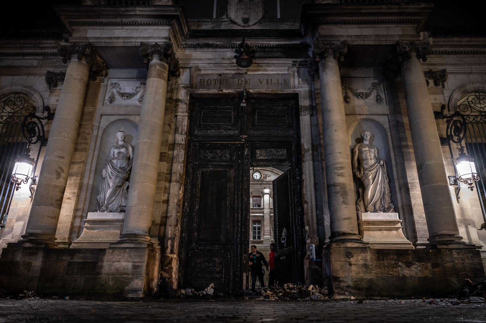 3月23日在波尔多市政厅被火烧毁的大门。摄影师:Philippe Lopez/AFP/Getty Images