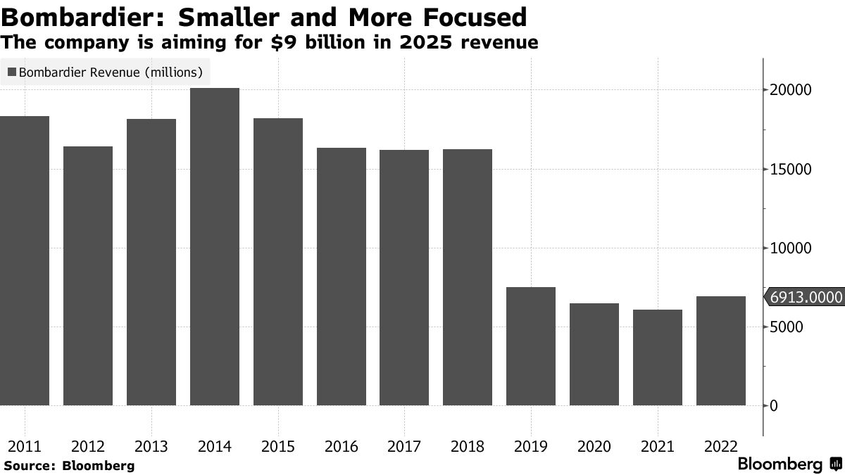 如今,他的任务不仅仅是让这家航空航天公司保持健康。他的任务是说服投资者,无论经济发生什么变化,他都有一个可信的增长计划。庞巴迪周四宣布了更为雄心勃勃的财务目标,力争在2025年实现至少90亿美元的营收和9亿美元的自由现金流。这一目标较之前的目标分别为75亿美元和5亿美元。