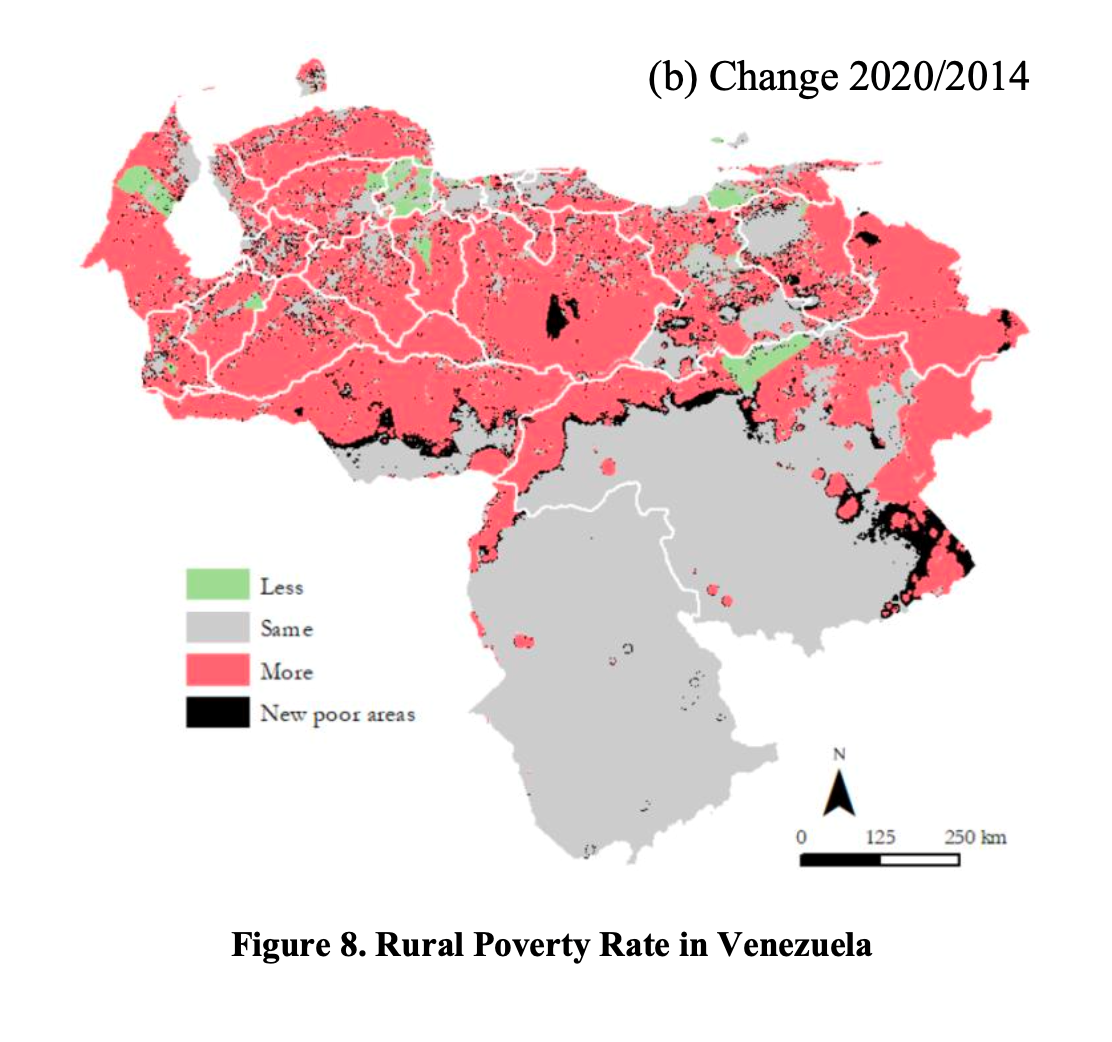 根据马尔多纳多的方法,以亚马逊州为例,这是委内瑞拉全国占比最高的土著人口州,该州的农村贫困率从六年前的76%上升至90%。在亚马逊州的一个市镇Manapiare,贫困率从30%上升至100%。