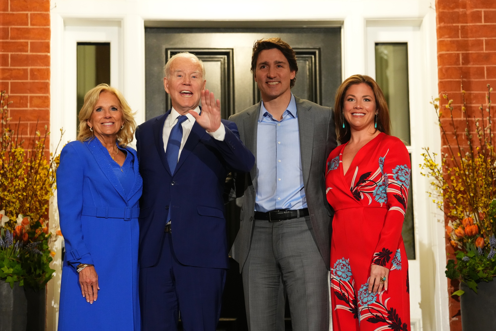 拜登和美国第一夫人吉尔·拜登与加拿大总理贾斯汀·特鲁多及其配偶苏菲·格雷戈瓦尔·特鲁多昨天在渥太华。摄影师:肖恩·基尔帕特里克/加拿大新闻社/彭博社### 您可以使用的解释
