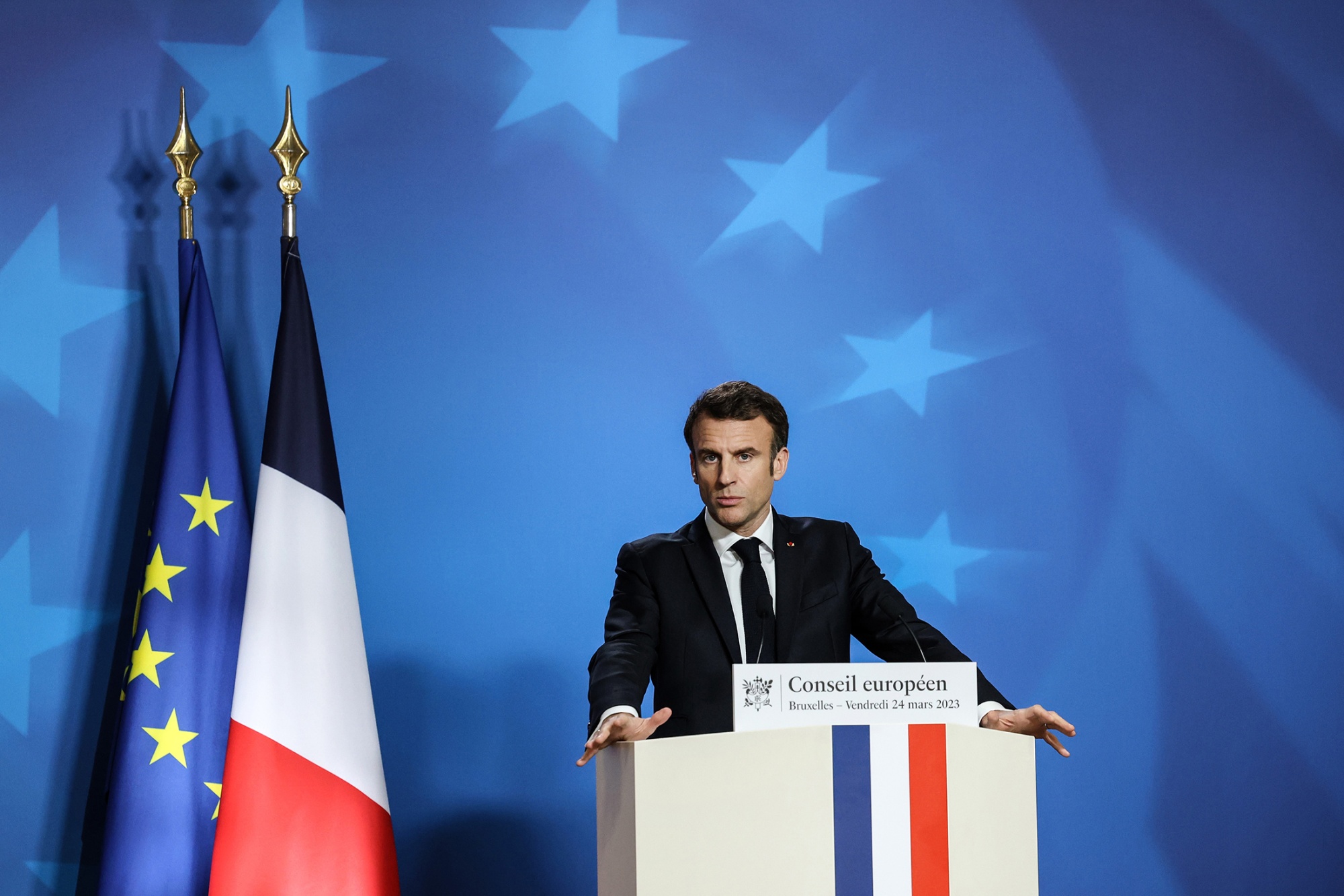 马克龙于3月24日在布鲁塞尔举行的欧盟领导人峰会上。摄影师:Valeria Mongelli/Bloomberg“欧元区一个被大多数人忽视的宏观风险实际上是RN在法国赢得大选,”总部位于巴黎的资产管理公司Group Richelieu的首席投资官Alexandre Hezez表示,“政治极端党派执政对债券市场始终是一个风险。”